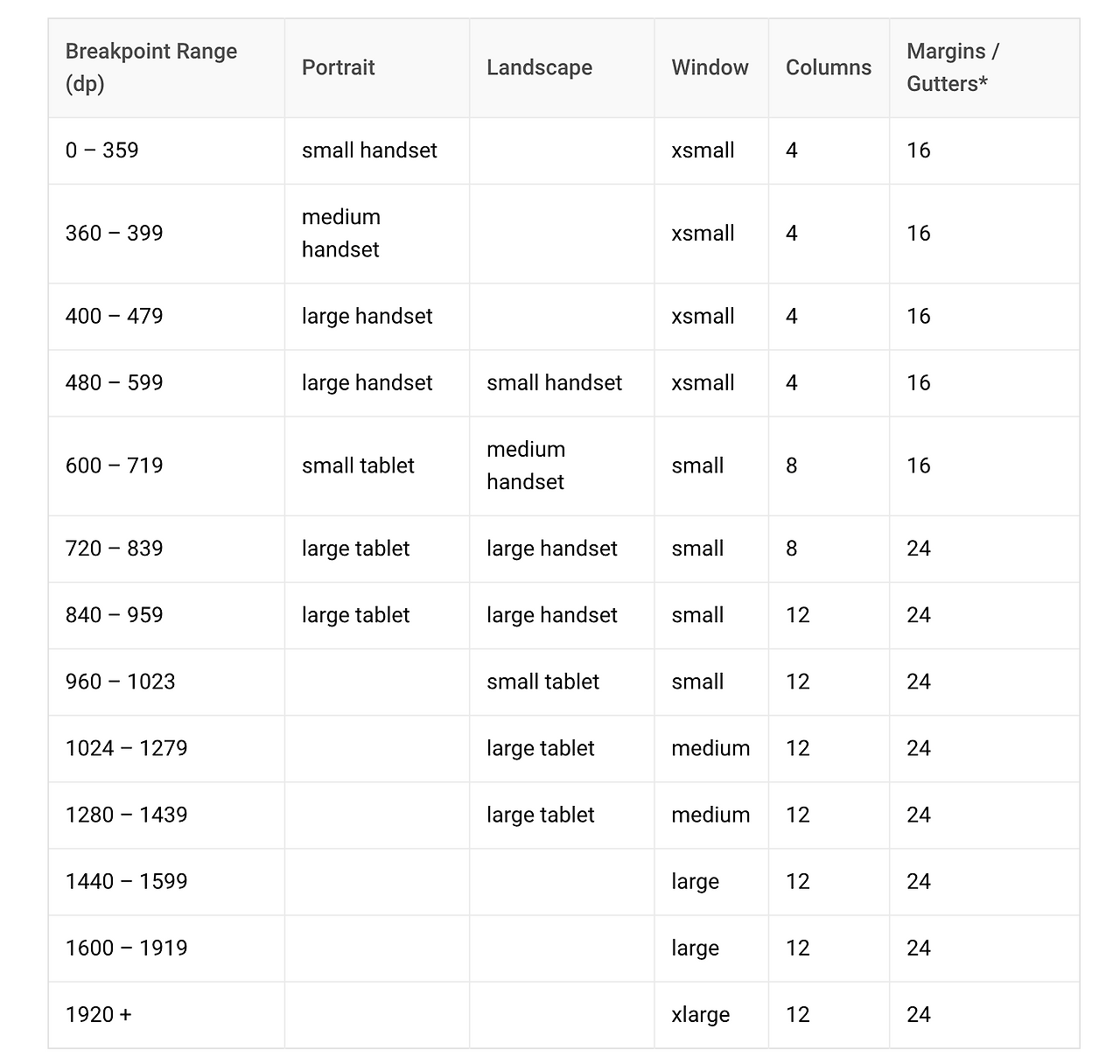 Material Design에서는 위와 같이 breakpoint에 따라 colums/margins/gutters를 정의하고 있습니다. 이런 식으로 그리드를 활용하여 디자인을 하게 되면 여러 가지 스크린에 대해서 유연하게 대응할 수가 있게 되죠.