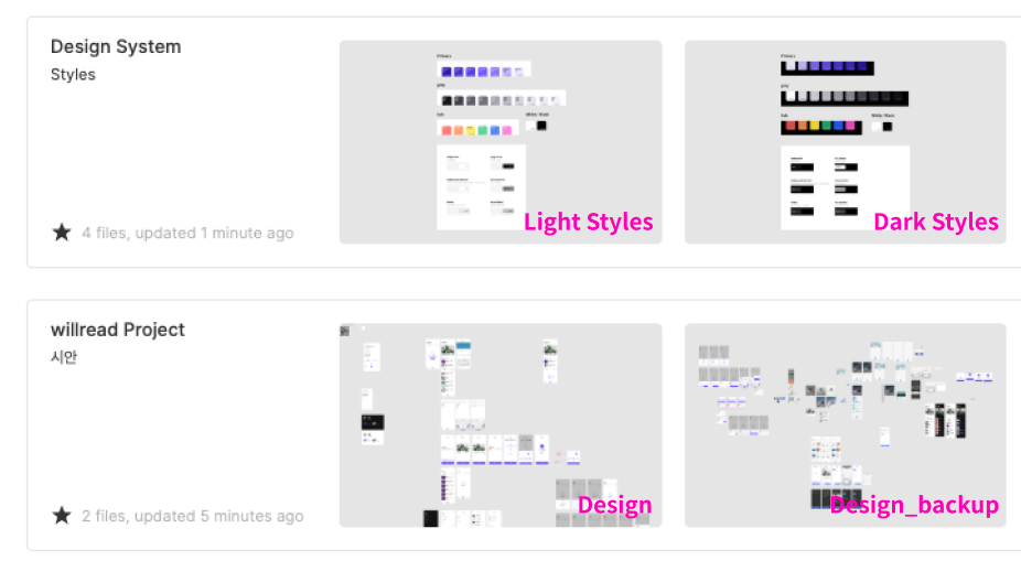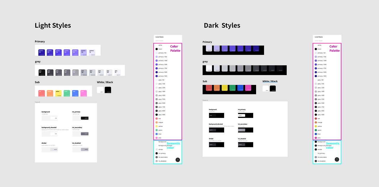 Figma는 같은 Hex코드를 두 가지 이름으로 저장할 수 있다. 그래서 위의 이미지처럼 한 파일에 컬러 팔레트와 시맨틱 컬러를 모두 저장할 수있다. 두 파일에 각각의 테마 기준으로 컬러를 모두 저장했다.