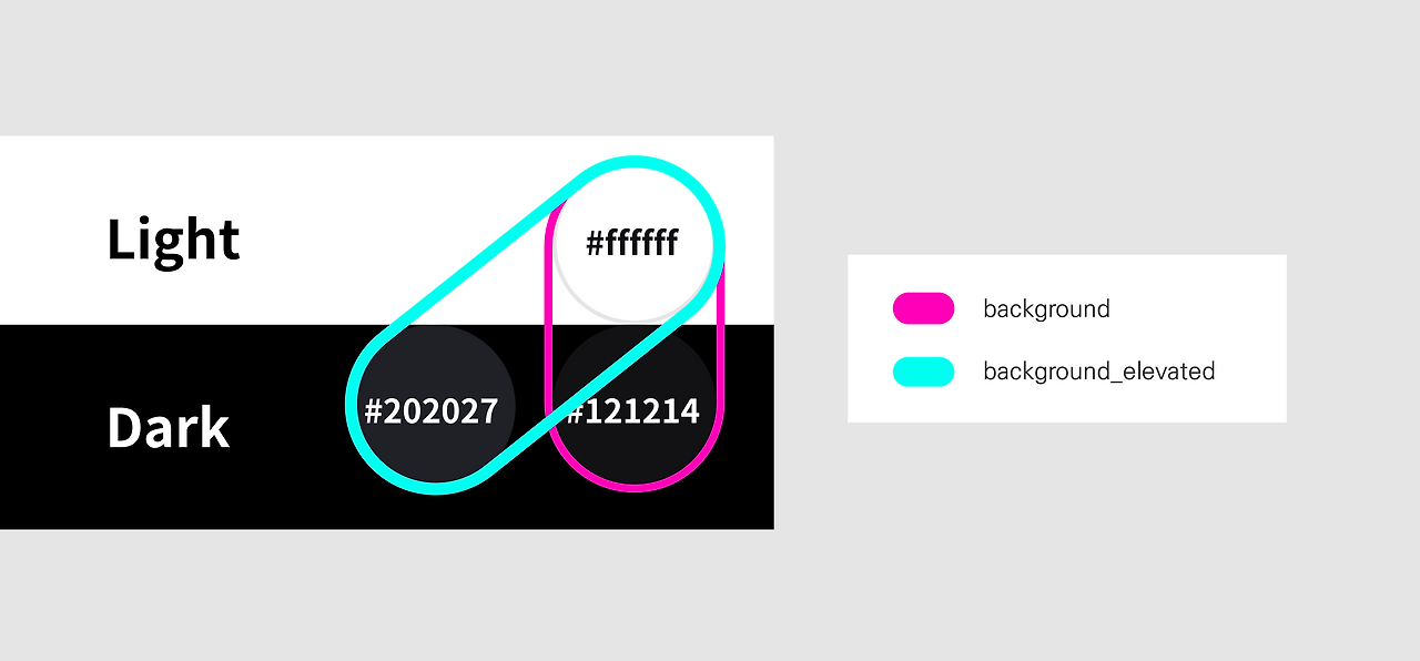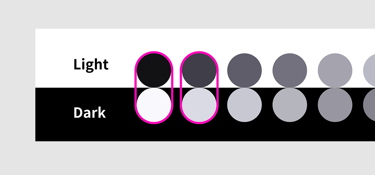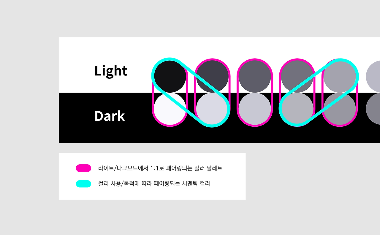 하지만 다크 모드를 고려하기 시작하면서 문제가 생겼다. UI에서의 한 역할을 하는 컬러에 대해서 라이트 모드와 다크 모드 컬러를 짝을 맞춰야 하기 때문이었다. 즉, 컬러 페어링을 하는 작업이 필요해졌다.