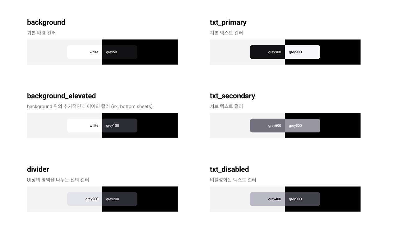 시맨틱 컬러는 사용되는 목적과 UI에 적용되는 상황에 따라 네이밍하는 컬러이다. UI에 적용되는 상황에 맞게 의미론적인 이름을 부여(ex. background, divider, txt_primary)하며, 여러 상황에 대해서 컬러 팔레트와 치환되도록 사용하면 다크 모드에 대응하기 편하게 만들어 준다.