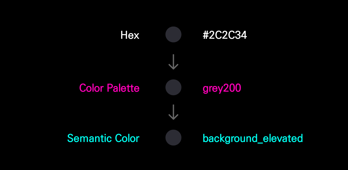 다시 말하면, 1대 1 매칭 시켜 둔 컬러 팔레트도 사용하되 그 위에 추가적으로 시멘틱 컬러가 필요하다고 판단되는 고리만 한번 더 엮어주는 방식을 택했다. 컬러 팔레트만으로도 사용할 수 있고, 의미론적인 이름 혹은 페어링이 필요한 상황에서만 시멘틱 컬러를 얹는 형태이다.