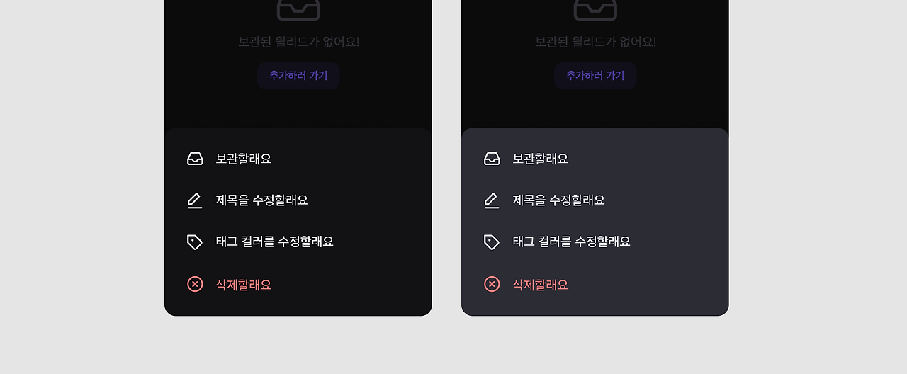 그런데, 라이트 모드로 디자인 후 페어링 된 컬러로 스위칭해보니 무언가 이상함을 느꼈다. 라이트와 다크 모드의 컬러가 무조건적으로 1대 1 매칭이 되지 않는다는 점이었다. 라이트 모드에서는 한 컬러가 두 가지 역할을 수행했는데, 다크 모드에서는 각각 다른 컬러를 사용해야 하는 상황이 생기는 것이다. 예를 들면 아래와 같은 상황이다.