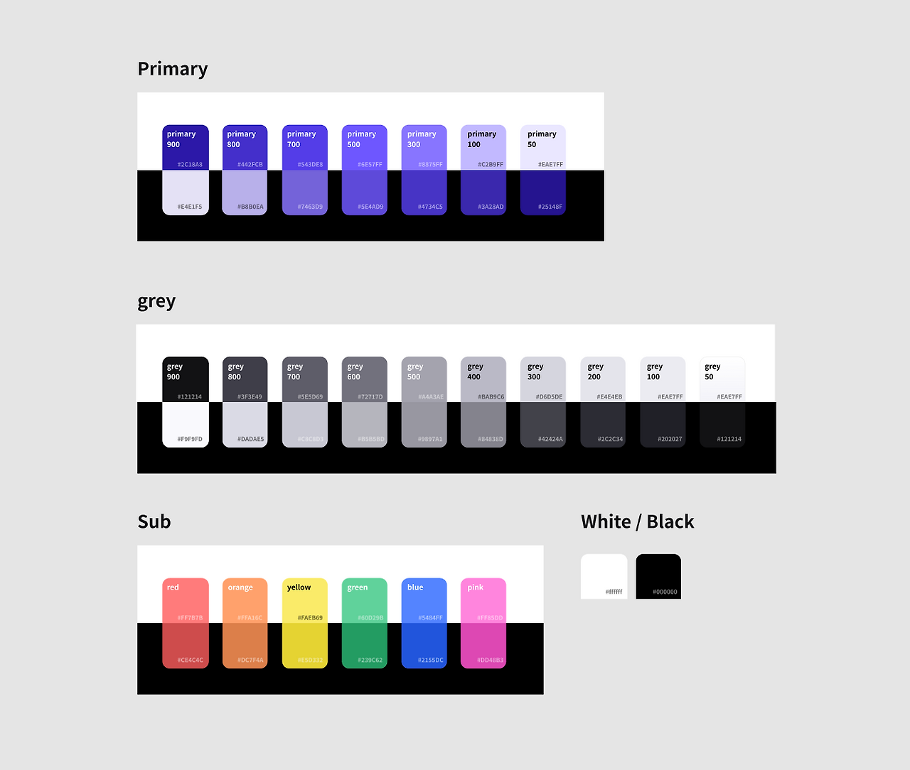 컬러 팔레트는 말 그대로 색 모음이다. 단순히 어떤 한 Hex 코드를 식별하기 쉬운 이름(ex. grey200, red50 등)으로 네이밍하고 라이트 모드와 다크 모드를 페어링한 거라고 보면 된다. 굳이 의미를 부여하지 않아도 충분히 컬러 팔레트 선에서 다크모드 대응이 어렵지 않은 컬러들도 있다. 그래서 무작정 다 시멘틱 컬러를 사용하는 게 아닌, 컬러 팔레트와 시맨틱 컬러를 혼용하여 사용하려고 했다.