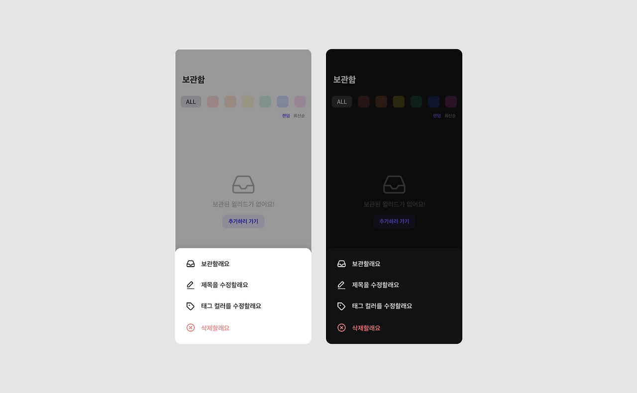 위 사진은 처음에 페어링한 색 그대로 다크 모드를 적용한 모습이다. 이처럼 바텀 시트가 올라오는 상황에서 라이트 모드에서는 명확히 레이어가 구분되는 반면 다크 모드에서는 거의 구분되지 않는다. 구분감을 주려면 조금 더 밝은 회색을 사용해야 한다. 그러려면 아래처럼 #ffffff는 #121214와 페어링 되어있으면서, 조금 더 밝은 회색인 #202027과도 페어링 되어 있어야 한다.