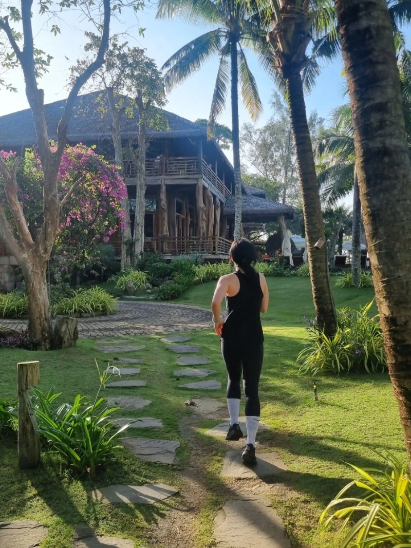 하지만 꽤 오랜 시간 바다를 건너 기대하던 여행지를 오게 되니, 그 걱정마저 한국에 두고 온듯, 거짓말처럼 마음이 가벼워지는 것 같았다. 한결 쉬워진 마음으로 기대했던 러닝을 드디어 할 수 있게 되었다. 천국같이 완벽한 리조트에서 잠을 푹 자고 일어나 바로 러닝 준비를 했다. 러닝복을 입고, 신발끈을 꼼꼼히 조였다. 갤워치도 차고, 선크림도 듬뿍 발랐다. 그리고 완벽한 러닝 메이트인 W의 지휘 하 꼼꼼한 준비운동 까지 마쳤다. 드디어! 해방의 뜀을 시작했다.