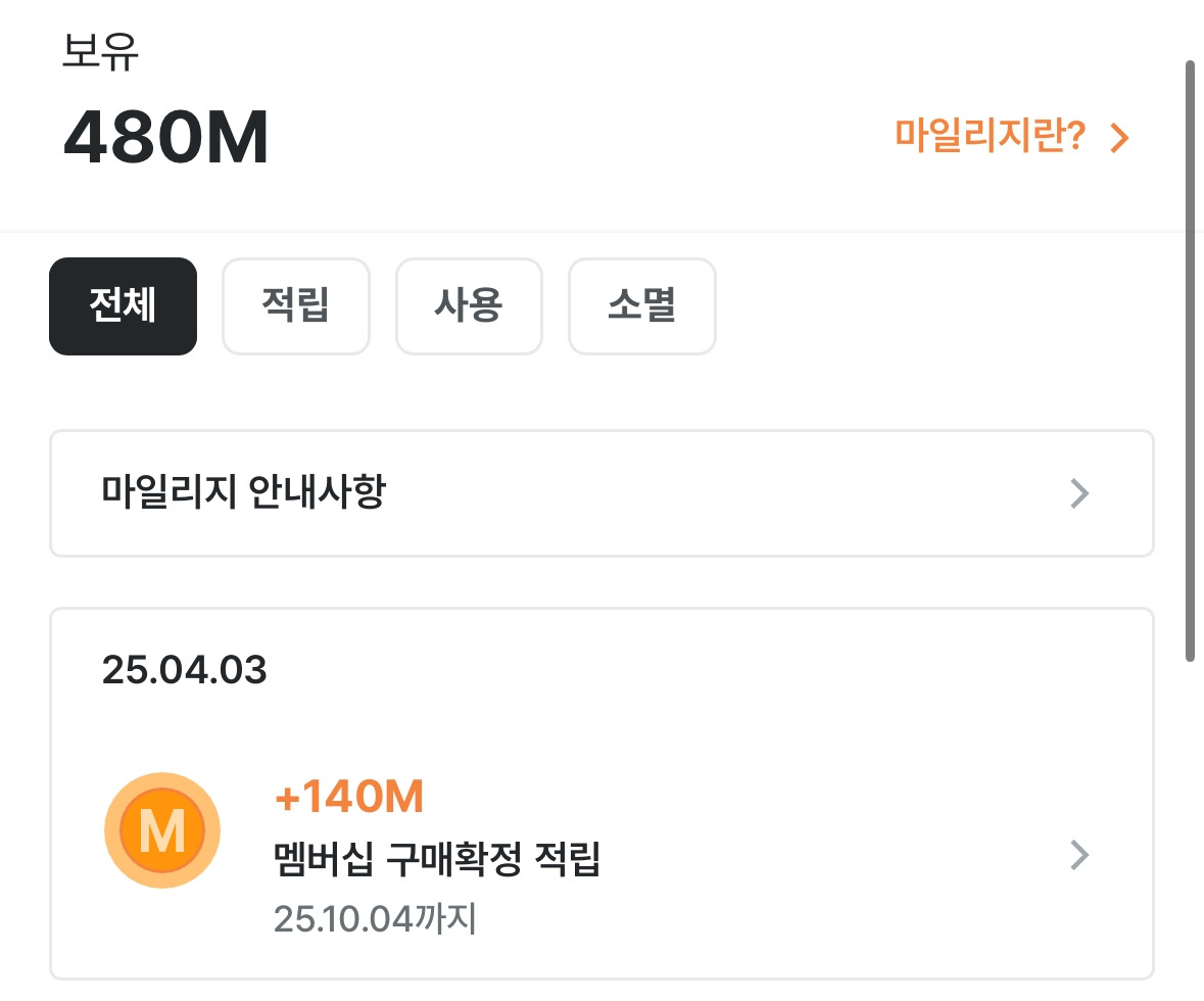- 전체 / 적립 / 사용 / 소멸 - 로 분류하고, 소멸 탭에 들어가면, "자 봐. 소멸 됐어. 아쉽지? 그러면 마일리지를 모아서 제 때 써야겠지?"라고 말하는 것 같다.
