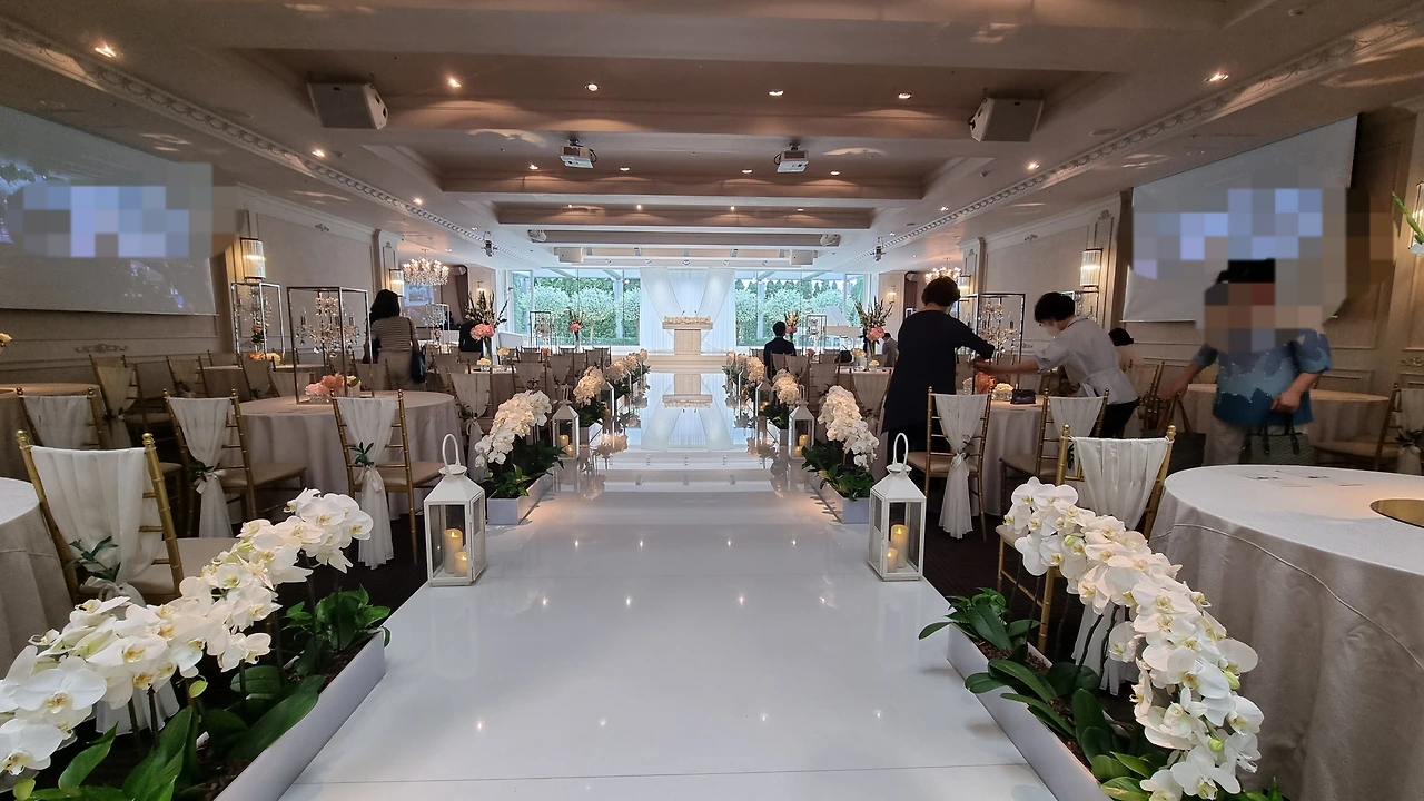 1번 홀이 산뜻하고 세련된 느낌이라면 2번 홀은 웅장하고 각 잡힌 느낌이었다. 무엇보다 버진로드가 상당히 길었다. 신부 대기실에서 곧장 식장으로 연결되는 버진로드의 길이는 40m라고 했다. E형 인간으로서 내가 내 결혼식에 이 정도 관심과 집중은 누릴 권리가 있지 않나, 하는 생각이 들었다. 게다가 버진로드가 마치 뮤지컬 무대처럼 위로 솟아 있었고 키가 작은 나는 그런 높이감도 마음에 꼭 들었다.