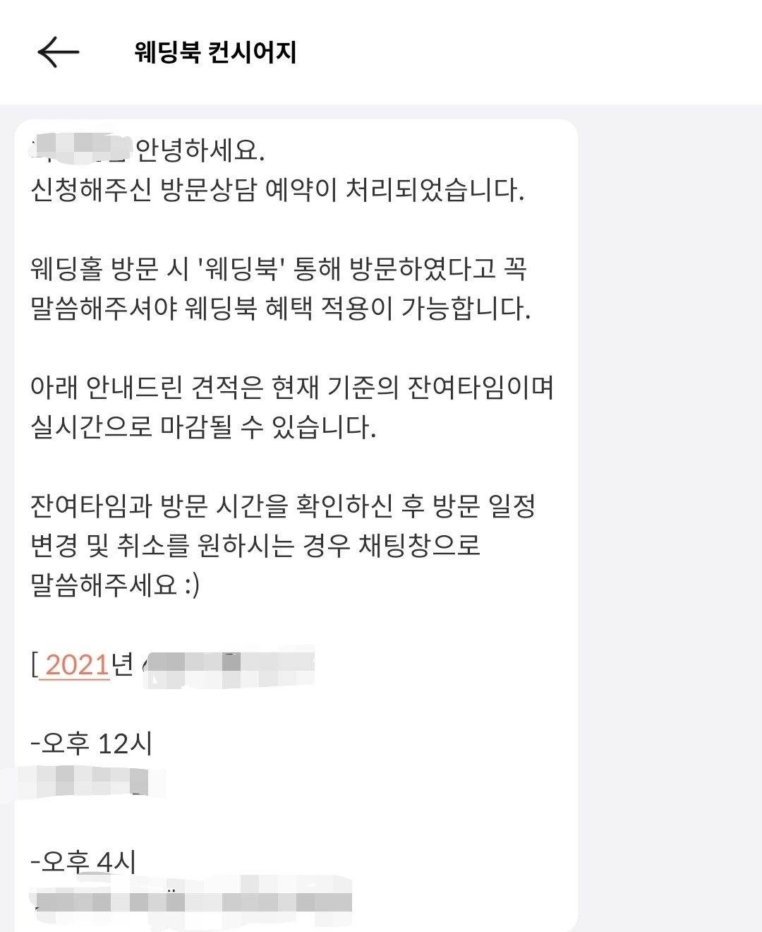 "오빠, 이번 주 토요일 12시, 16시에 웨딩홀 투어 하려고. A홀을 보고 B홀로 이동할 거고 점심은 근처 ㅇㅇ에서 먹자. 혹시 걸리는 거 있어?"