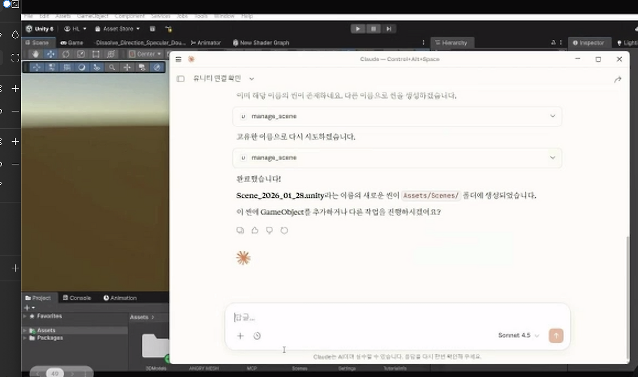 AI 채팅창에 유니티 아이콘이나 MCP 연결 표시가 뜨면 이제 AI가 내 프로젝트의 하이어라키와 파일을 읽을 수 있습니다.
