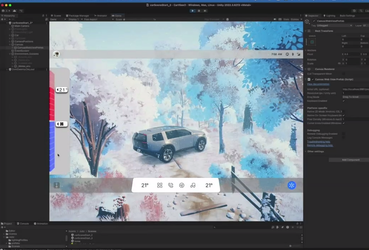 유니티의 3D 배경(눈 내리는 실외 및 차량) 위에 프로토파이로 만든 UI 요소(하단의 온도 조절, 음악 컨트롤바 등)가 얹어져 있는 상태로 디자인한 UI 버튼을 눌렀을 때 3D 환경 속 차량의 조명이 바뀌거나 상태가 변하는 등의 공간 인터랙션을 개발 전 미리 확인할 수 있음.