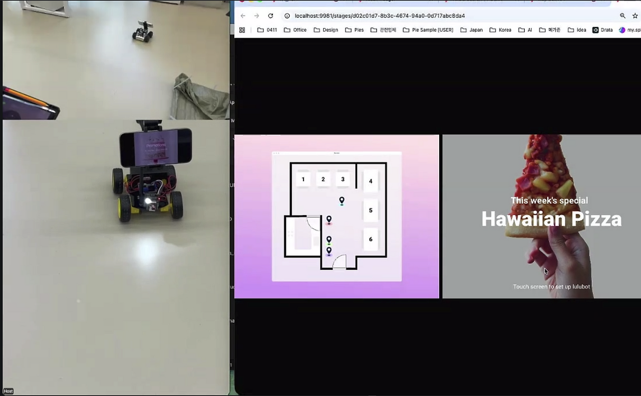 예시 | 상태 피드백: 로봇에 달린 센서(장애물 감지 등)가 읽은 정보를 다시 프로토타입 화면에 실시간으로 띄워 양방향 인터랙션을 검증