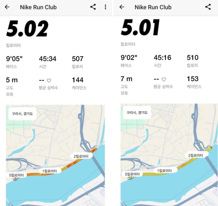 신기하게도 목표를 5km 달리기로 우선 설정하고 러닝을 해보니 나름 일주일을 계속해서 운동했던 것이 효과가 있었나 봅니다. (중간에 두 번 쉬었지만) 9분 후반 때~ 9분 중반 때를 기록하던 저의 페이스는 나름대로 조금 줄어들어 9분 초반대를 기록했습니다. 아마도 걷는 양이 조금은 줄어든 모양입니다.