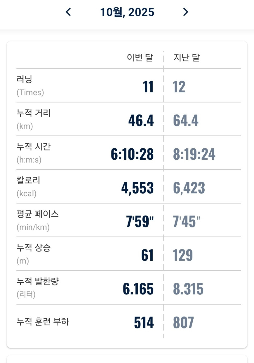 그러고 보니 10월에는 추석연휴도 있었고 비도 워낙 자주 왔기에 밖에서 달리기를 선호하는 저로써는 달리는 횟수가 줄어들 수밖에 없었다는 또 다른 핑곗거리가 있는 것 같습니다.