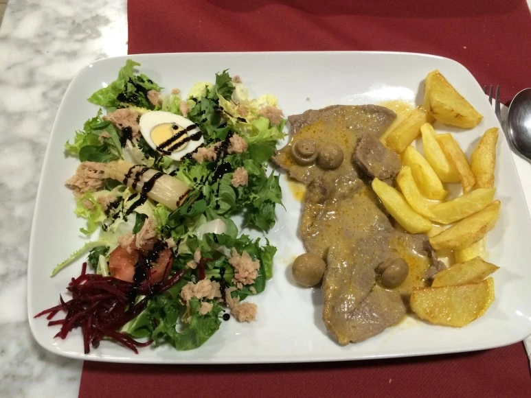 산티아고 순례길에 있는 식당에서는 순례자들을 위한 순례자 메뉴가 있다. 순례자 메뉴는 와인과 물 중 한 병을 제공해주고 에피타이저, 본식, 디저트를 차례대로 제공해준다. 가끔 에피타이저는 없는 경우도 있지만 보통 10유로 정도면 한 끼를 해결할 수 있다. 와인 값도 포함하여 10유로니 한국과 비교해도 정말 저렴하게 식사를 제공해주는 편이다. 토산토스는 마을이 너무 작아 마트도 없고 오늘은 늘 같이 저녁을 먹던 한국 사람들도 없어서 알베르게에서 제공하는 순례자 메뉴를 주문해 먹어야만 했다. 돈을 아껴야 겠다는 이유로 아내만 먹이고 나는 먹지 말까 하는 생각을 잠깐 해보았다.