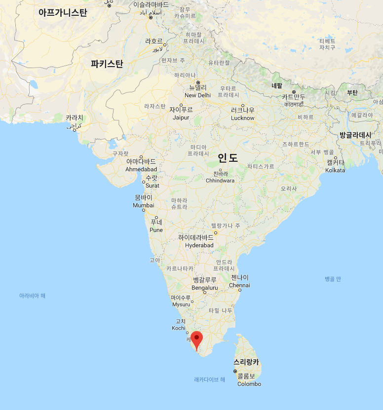 자정 무렵 남인도의 상공에 불빛이 번뜩인다. 지상의 만물은 본연의 색을 숨기고 짙은 어둠 속에 잠겨있다. 기체가 내뿜는 섬광은 잠든 마을을 향해 불청객마냥 줄기를 쏘아댄다. 바퀴가 요란하게 구르고 내디딘 지면은 낮의 열기를 채 식히지 못해 후덥지근하다. 한겨울 서울의 냉기는 열대의 땅에서 자취를 감춘다. 늦은 시간이라지만 공항은 이상하리만치 조용하다. 도시의 침묵을 닮아 여행자의 흥분을 가라앉힌다. 제일 먼저 건물 상단의 간판이 눈에 띈다. 동글동글하고 앙증맞은 글씨체는 도무지 해독할 수 없다. 그 아래에 영어로 쓴 낱말을 읽고 서야 케랄라(Kerala) 주의 공용어인 말라얄람어로 쓴 이름임을 눈치챈다. 도시의 본래 명칭은 티루바난타푸람(തിരുവനന്തപുരം)이다. 발음이 어려워 영국 식민지 시절부터 사용한 영어 지명 트리반드룸(Trivandrum)으로 부르기도 한다. 티루바난타푸람은 인도 남서부 케랄라의 주도로 대륙의 끝자락에 위치해 있다.