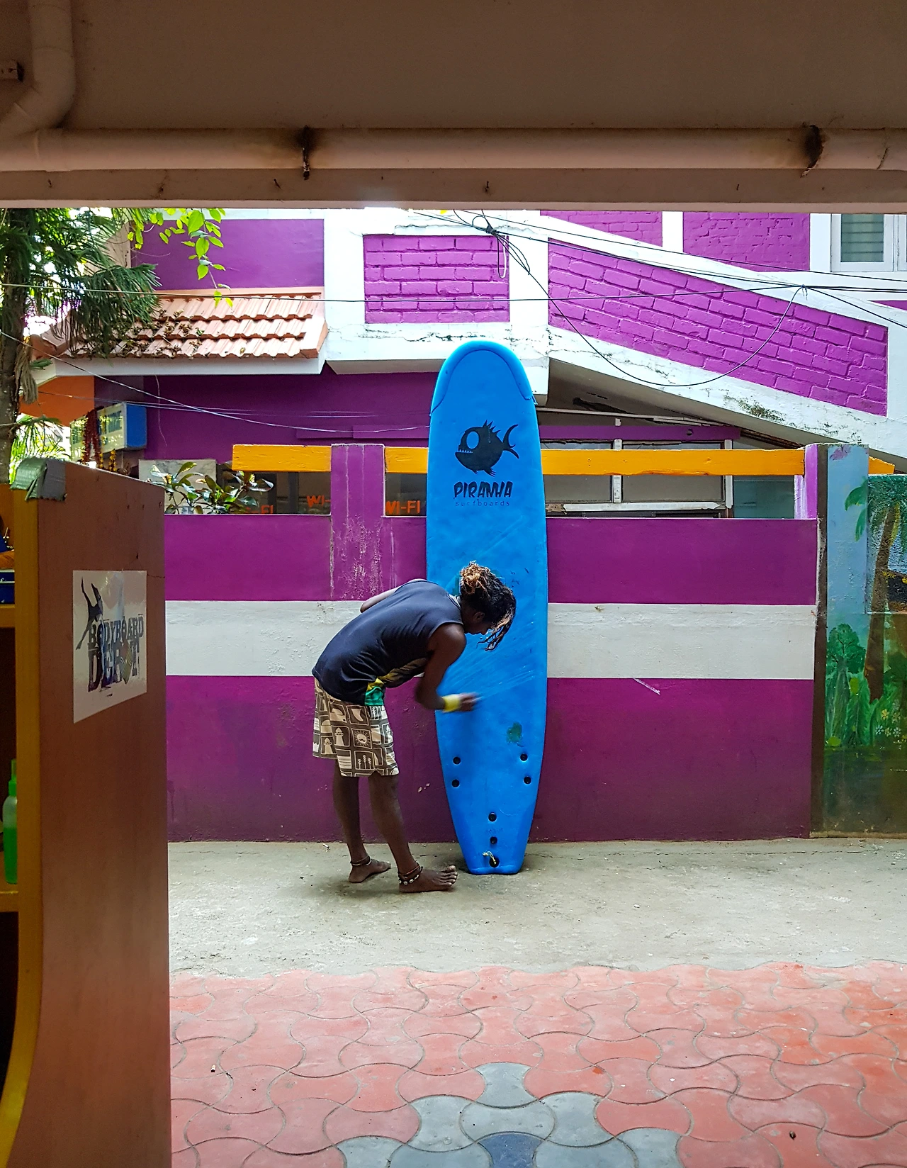 'Find us on the beach'라는 미션을 달성하는 게 보통 일이 아니다. 카난은 오늘 내가 탈 보드에 왁스칠을 하고 있다.
