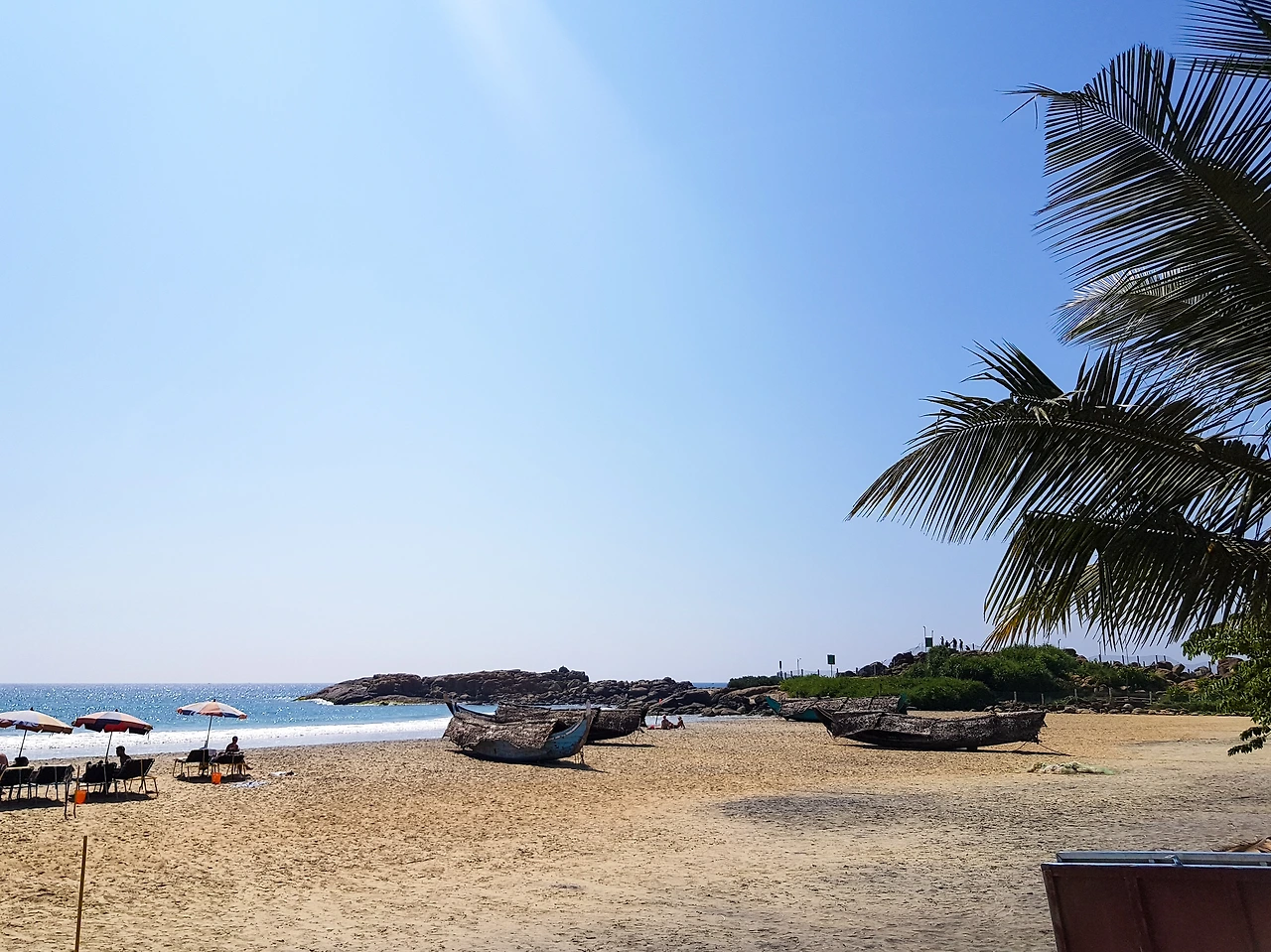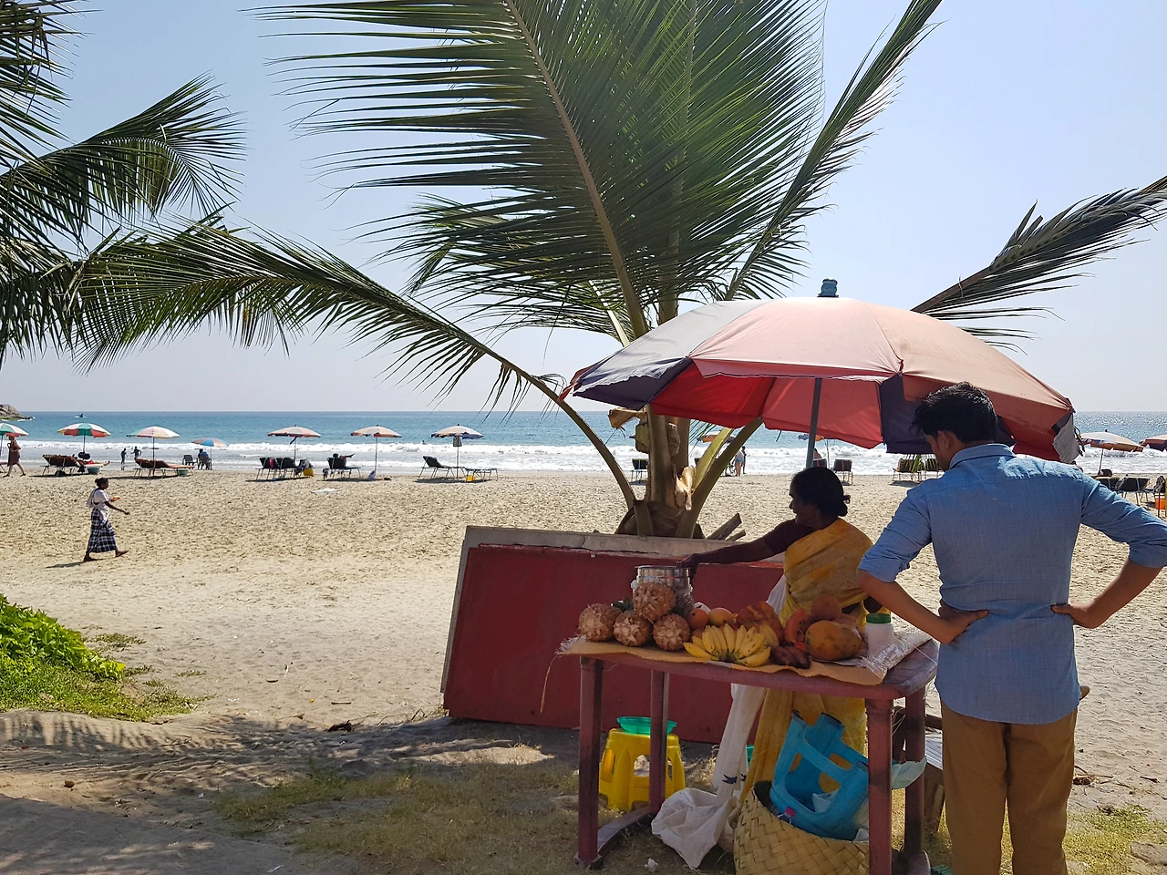 코발람에서는 여행자의 여유와 현지의 삶이 공존한다. 해변 가장자리에는 어부의 배가 파라솔 옆에 놓여 있다.