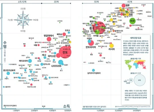 네 단계의 구분은 나에게 굉장히 설득력 있게 다가왔는데 아프리카의 동남부를 훑으며 달라지는 삶의 수준을 체감했기 때문이다. 아프리카 대륙의 위에서 아래로 향할수록 대체로 생활이 편리해지는 것을 목격했는데 세계 건강 도표가 이 차이를 명확하게 설명한다. 북부의 에티오피아는 1단계, 중부의 탄자니아는 1단계와 2단계의 사이, 중남부의 잠비아는 2단계, 남부의 보츠와나와 남아프리카 공화국은 3단계에 속한다. 같은 개발도상국이지만 소득 수준과 삶의 격차가 뚜렷하다. 더욱이 거대한 아프리카 대륙을 하나의 개념으로 설정하는 것이 얼마나 무지한 일인가.