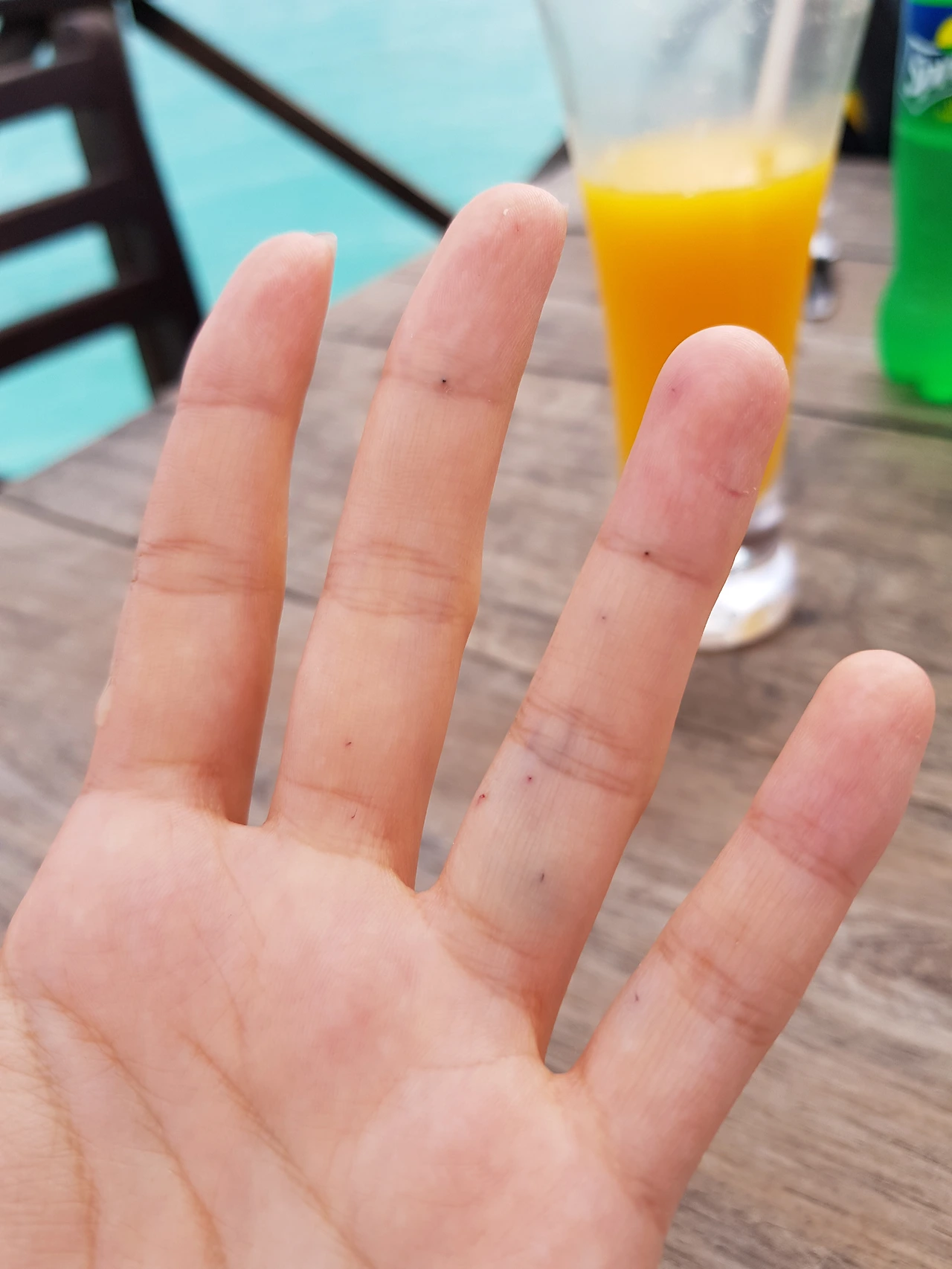 - 잔지바르에서 다이빙을 하다가 성게를 건드렸어요. 가시가 손에 박혔는데 빠지지 않아요.