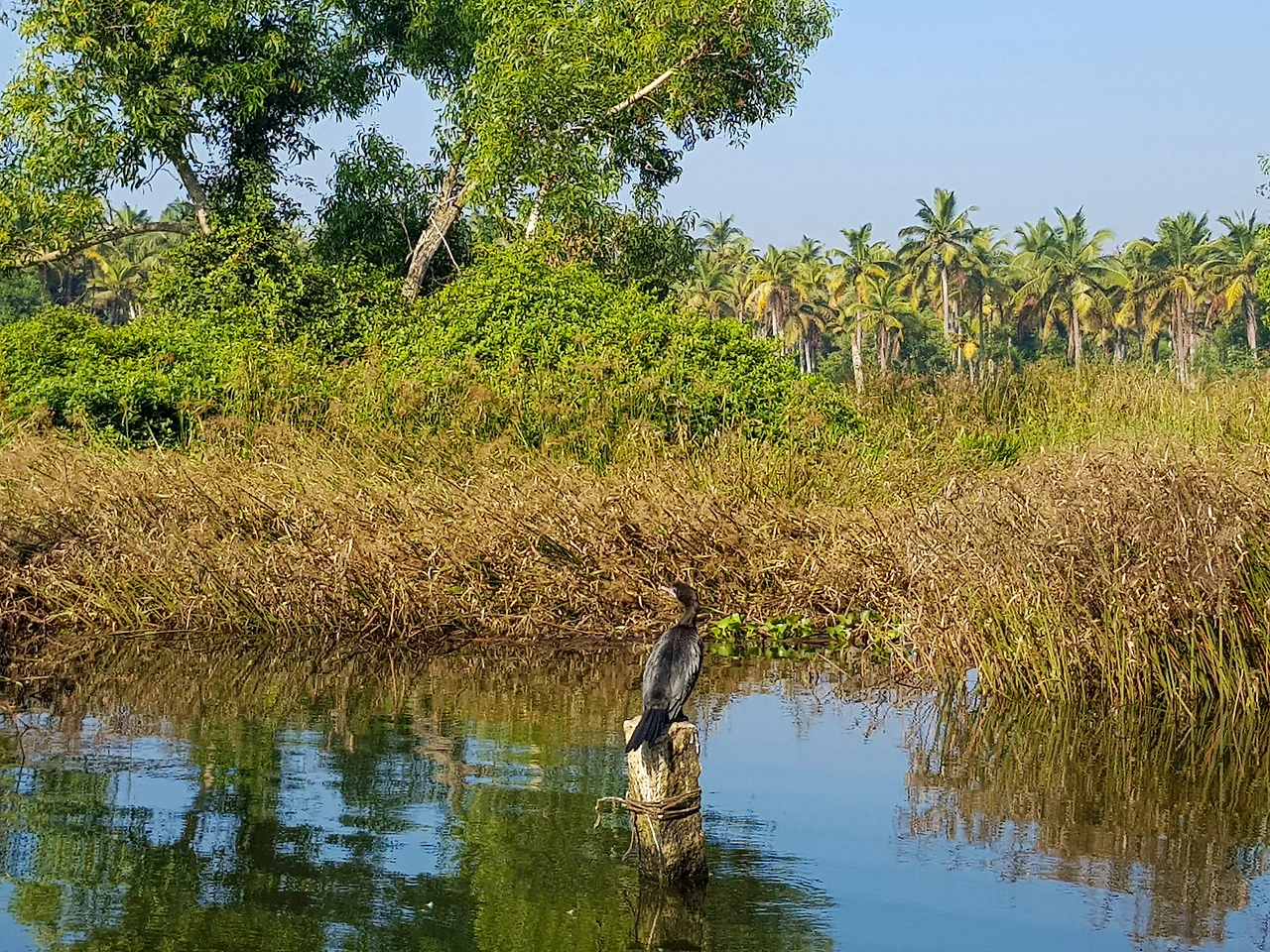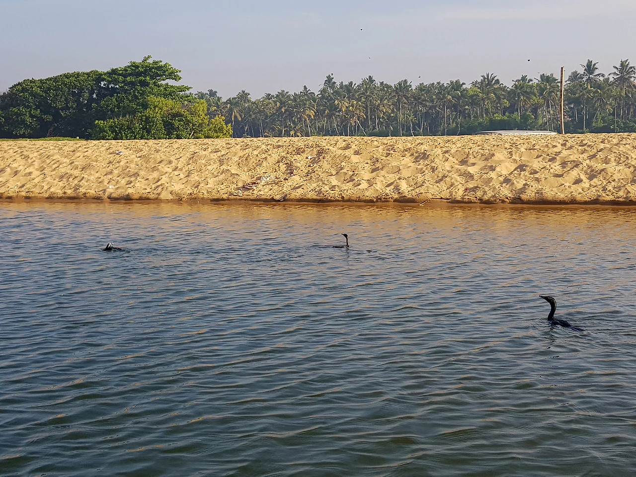 열대의 삼림 틈바구니에 주인 없는 빈 배들이 떠 있다. 파란 덮개가 있는 걸 보니 버려진 건 아닐 텐데 민가 주변의 계단이나 나루터에 묶어두지 않는 까닭이 있는 걸까. 갑판 위는 새들의 휴식처이다. 그중 낯익은 모양이 있다. 머리부터 꼬리까지 이어지는 깃털은 시선을 사로잡는 형광 파랑에 배 쪽은 오렌지빛이다. 물총새(kingfisher)를 볼 줄이야. 인도 맥주 대표 브랜드 킹피셔는 화려한 빛깔의 앙증맞은 녀석의 이름에서 따왔다. 목을 빼고 고깃배를 관찰하다가 다시 거대한 운하의 품으로 들어간다. 불어난 강물을 타고 가마우지(darter) 떼가 날아든다. 먹물을 뒤집어쓴 듯 시커먼 몸을 물에 담그고 가늘고 긴 목과 뾰족한 부리만 수면 위로 내놓고 있다. 생김새가 뱀과 닮아 뱀새(Snakebird)라고도 부르는데 먹이를 사냥할 준비태세를 갖추고 있다. 바다새와 함께 흘러가는 물길의 풍경이 조금씩 달라진다. 야자수는 저 멀리 몸을 숨기고 강변을 모래 둔덕이 차지한다. 백워터의 끝에서 바다가 있다.