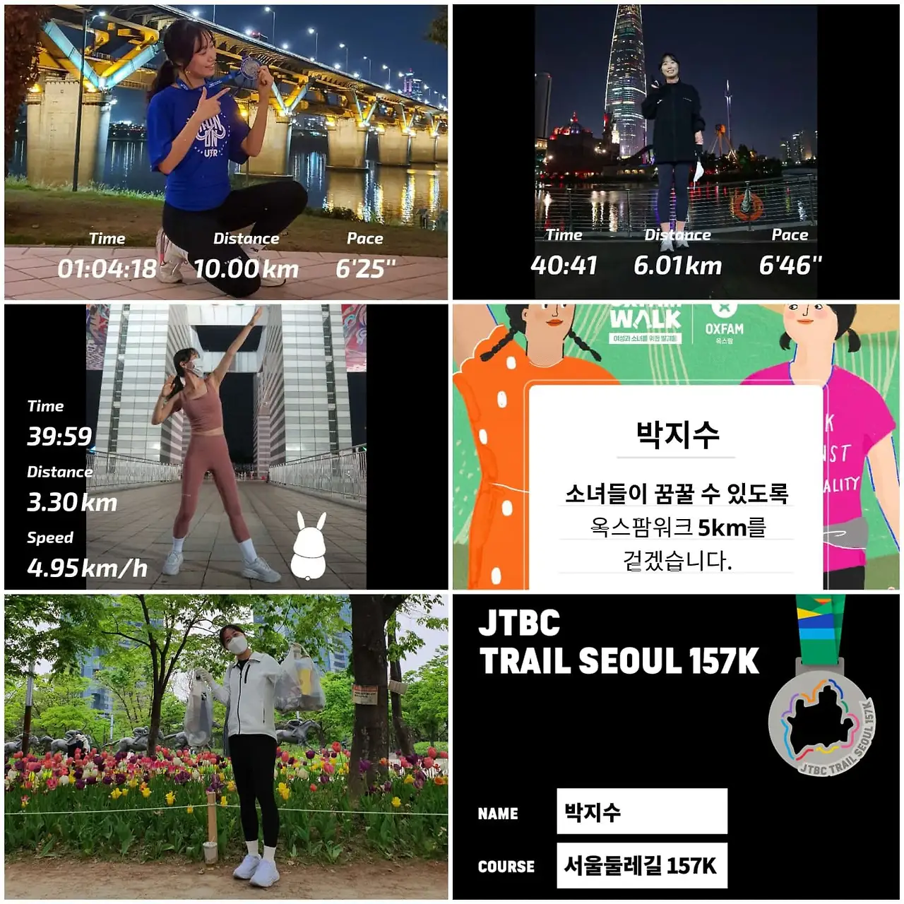 지난해부터 시작한 달리기를 주운동으로 하고 있다. 건강을 유지하면서 의미 있는 활동을 함께 할 수 있도록 대회에 여섯 번 참여하였다. 4월 22일 지구의 날을 맞이하며 2021 언택트 헤이, 플로깅에 참여하였다. 플로깅은 달리면서 쓰레기를 줍는 활동으로 지구 곳곳에서 일어나는 다양한 형태의 기후 변화와 위기에 많은 사람들의 관심을 불러일으키고자 한다. 옥스팜 워크는 깨끗한 물을 전달하고 소녀들이 꿈꿀 수 있도록 지원한다. 매일 두 시간 이상을 걸어 물을 뜨러 가는 아이들이 깨끗한 식수를 얻고 학교에 다닐 수 있도록 응원을 전했다. 오늘 러닝 챌린지를 통해 서울 성북구 소재 중학교 저소득층 아이들에게 기부를 할 수 있었다. 달리기 완주 목표인 12km를 달성한 점도 굉장히 기쁘다.