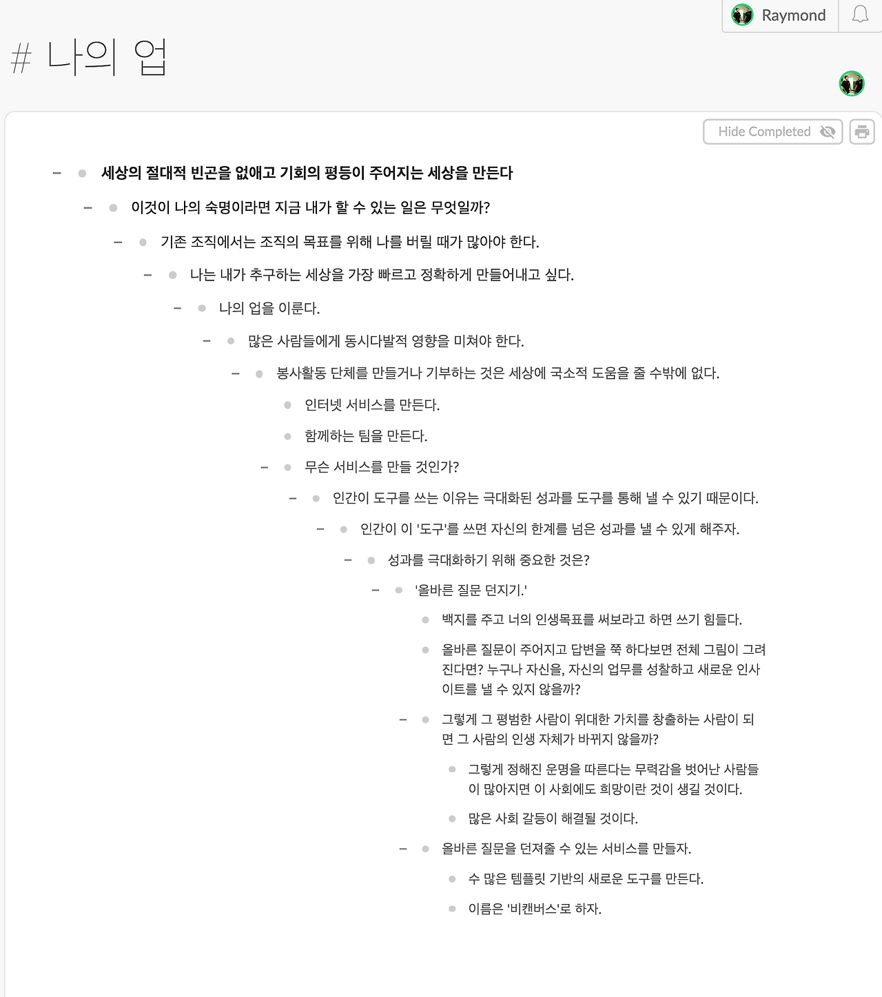 비캔버스의 '아웃라이너' 템플릿을 이용하면 이렇게 Top-Down 식 설계를 매우 쉽게 작성할 수 있다.