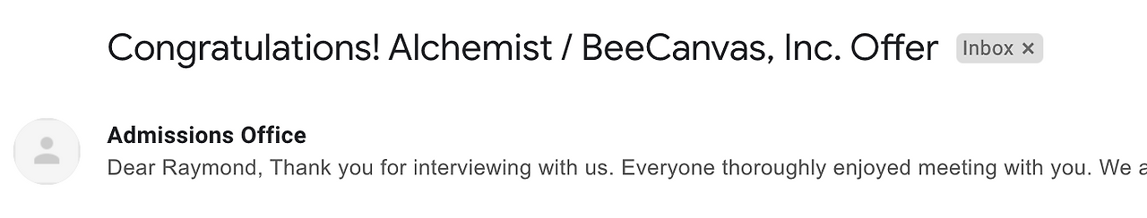 그렇게, 알케미스트 액셀러레이터에 지원하고 이틀 뒤, 인터뷰를 하라는 연락이 왔다. 인터뷰는 알케미스트와 알케미스트 출신 파운더들, VC들로 구성이 되어있었는데 물어보는 질문이 한국하고는 조금 결이 달랐다. 그렇게 인터뷰가 끝나고 3일뒤에 이메일이 도착했다.