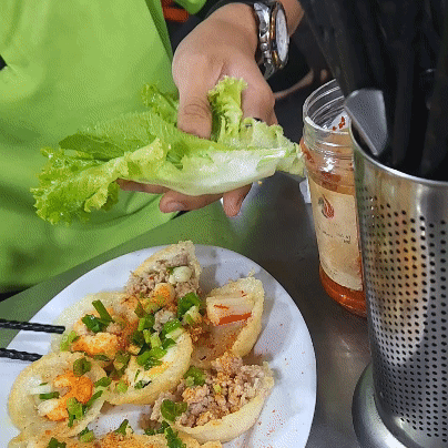 다음은 코코넛 넣어 반죽한 밀가루에 여러가지 토핑을 넣어서 만든 음식이었다. 타코야끼 반으로 잘라놓은 느낌이었는데 그냥먹어도되고 같이 나오는 야채에 쌈을 싸서 먹어도 된다고했다.