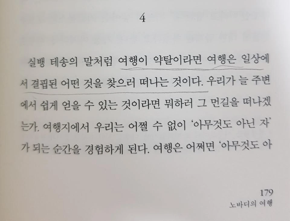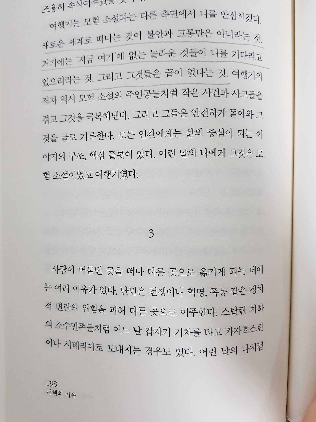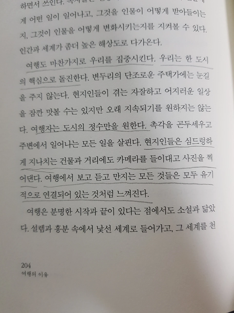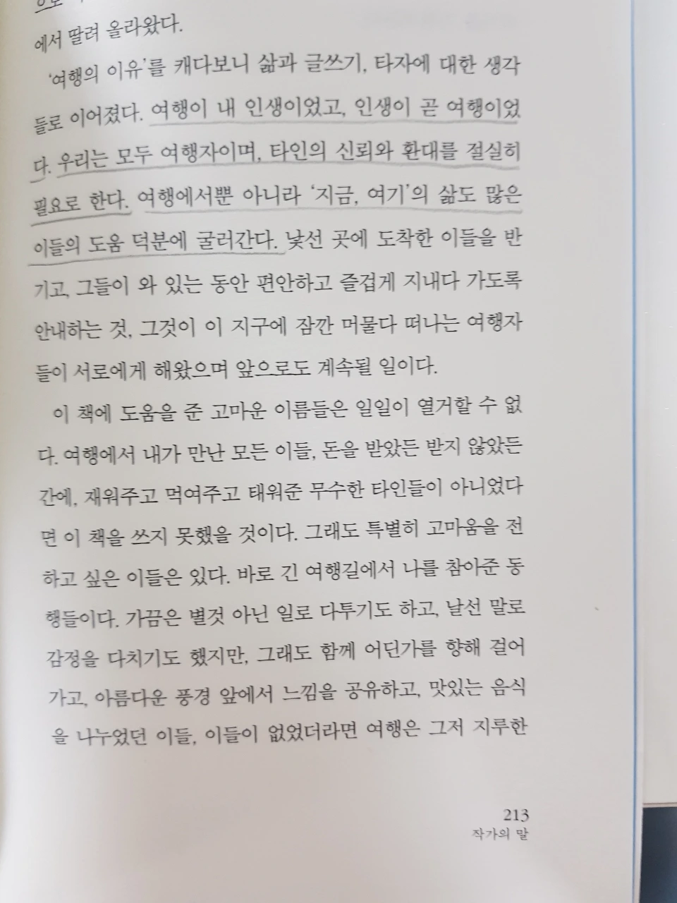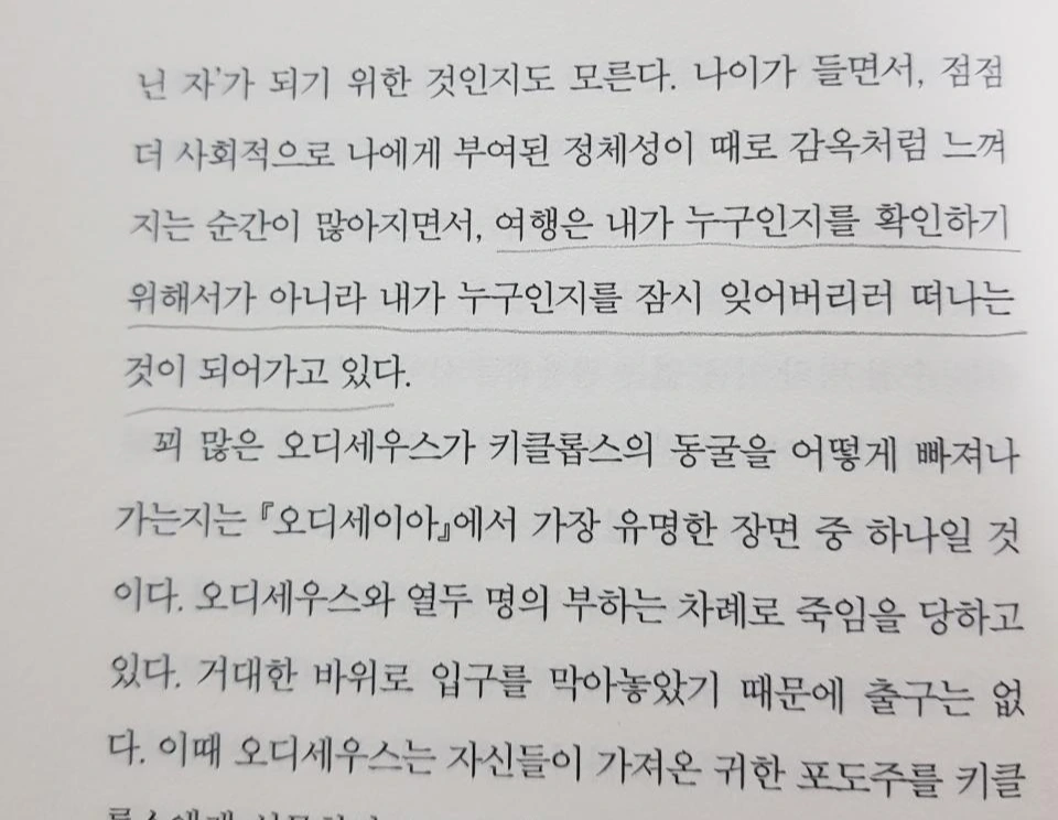 '여행을 하는 이유'라는 제목으로 글을 써보고자 했던 사람으로서 '여행'이 얼마나 간단하지 않은 주제인지 깨달았다. 물론 글의 범위나 깊이는 작가에 따라 달라질 수도 있지만 '여행'이라는 주제만으로 이 정도의 책을 써낸다는 것이 놀라울 뿐이다. 작가가 여행에 대해 얼마나 생각하고 고민하며 지금까지의 여행 내공을 다 쏟아냈는지 느낄 수 있었다. 여행을 하는 이유를 단순하고 단편적으로 몇 가지 뽑아내어 그것에 대해 써보려고 했던 나에게 여행에 대해 더 다양한 관점과 깊이로 생각할 수 있도록 자극을 준 책이다.