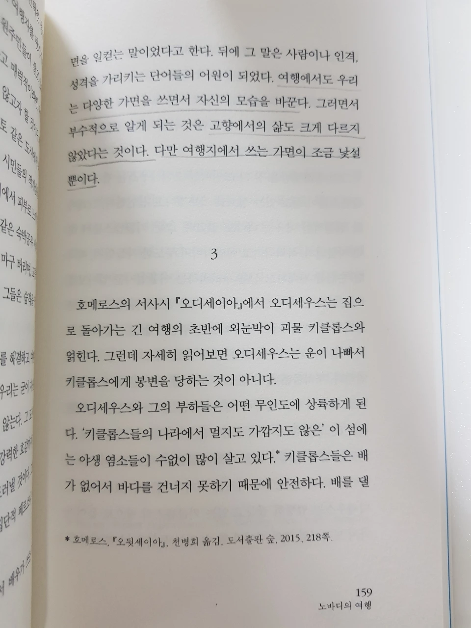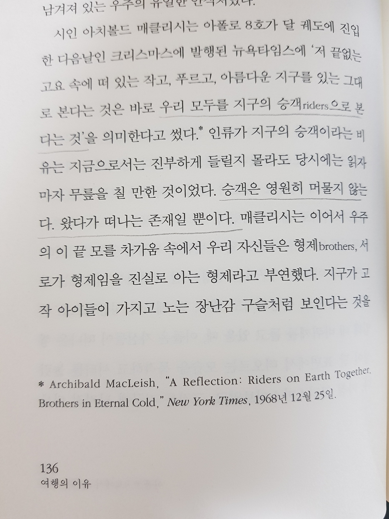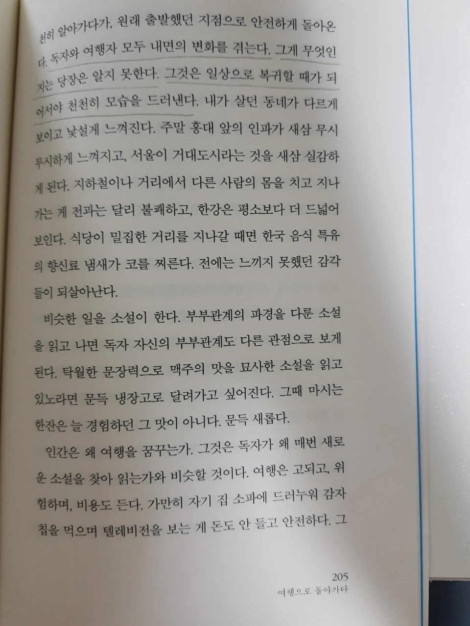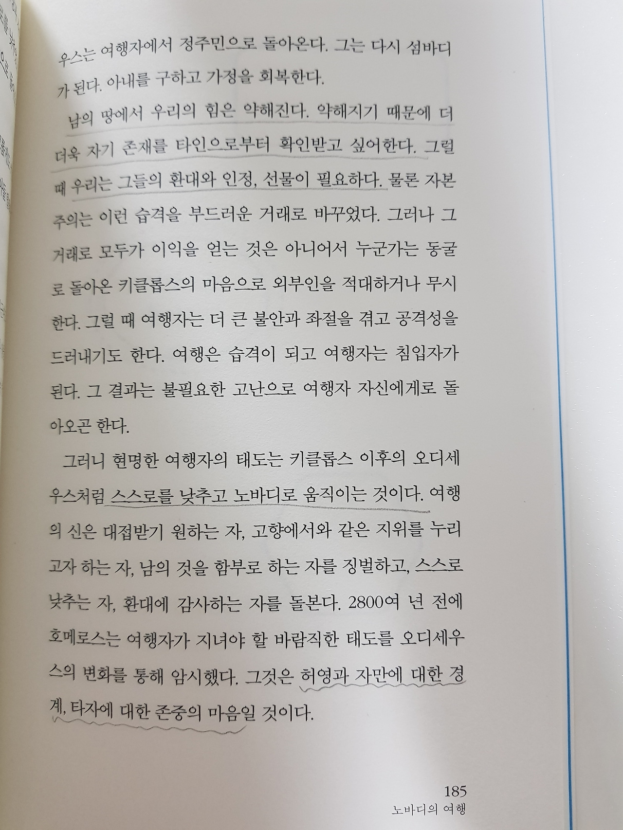 '여행을 하는 이유'라는 제목으로 글을 써보고자 했던 사람으로서 '여행'이 얼마나 간단하지 않은 주제인지 깨달았다. 물론 글의 범위나 깊이는 작가에 따라 달라질 수도 있지만 '여행'이라는 주제만으로 이 정도의 책을 써낸다는 것이 놀라울 뿐이다. 작가가 여행에 대해 얼마나 생각하고 고민하며 지금까지의 여행 내공을 다 쏟아냈는지 느낄 수 있었다. 여행을 하는 이유를 단순하고 단편적으로 몇 가지 뽑아내어 그것에 대해 써보려고 했던 나에게 여행에 대해 더 다양한 관점과 깊이로 생각할 수 있도록 자극을 준 책이다.
