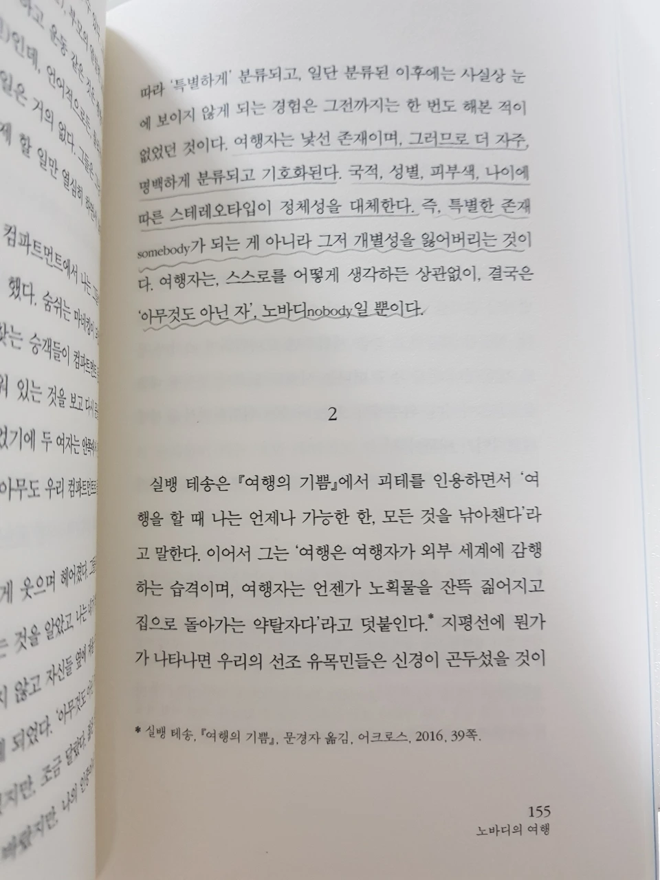 벗어날 수 없을 것만 같은 정체성도 여행을 떠나는 순간 나는 '노바디'가 되어 누군가의 딸도, 어딘가의 직원도 아닌 '아무것도 아닌 자'가 된다. 딱히 무엇이라 말할 수 없는 사람이 되어 여행하는 순간. 그 순간의 기분은 이상하면서 동시에 새롭다.