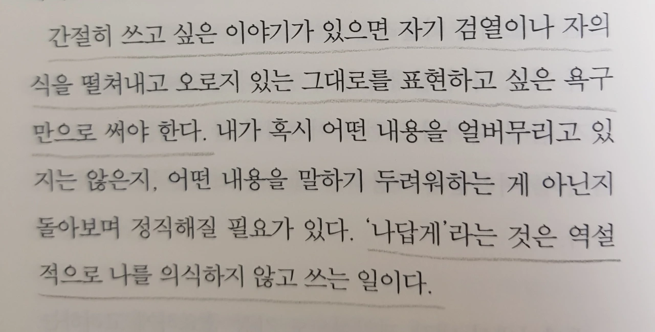 누군가 내 글을 읽도록 만들 '고유의 문체, 고유의 매력'. 많고 많은 책들 사이에서 독자의 눈에 띄어 읽히기 위해서 필요한 조건일 것이다. 무슨 말인지는 알겠지만 어떻게 '나만의 고유한 문체'가 만들어질 수 있는지는 모르겠다. 계속 쓰다 보면 자연스레 만들어지는 걸까, 고민과 연구(?)를 해야 하는 것일까.