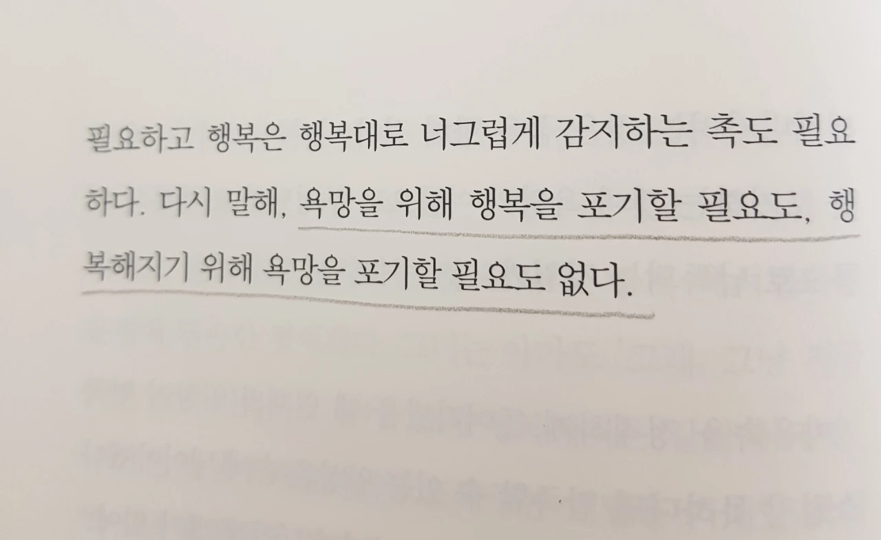 지금 그대로도 좋다는 생각으로 현재를 만족하며 살아가는 것도 좋겠지만 더 나은 하루, 결핍이 충족되는 하루를 만들기 위한 욕망이 필요하다는 작가의 말. 행복과 욕망을 연결 지어 볼 생각은 해본 적이 없었다.