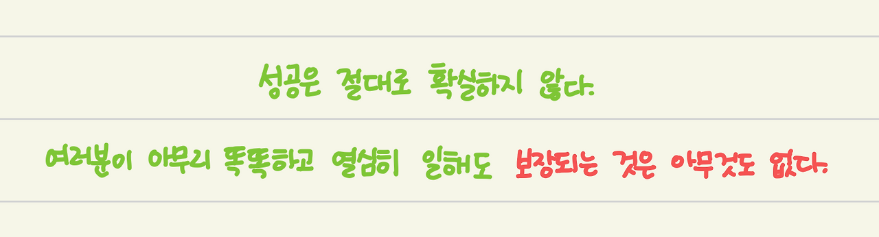 먼저, 불확실성이 있어야 성장할 수 있으며 새로운 일에는 늘 불확실성이 따른다고 합니다. 성공한 사람들의 공통점은, 성공할 것이라 확실했기 때문에 계속 해나간 것이 아니라, 불확실하더라도 그만두지 않고 행동했기 때문입니다. 목표했던 일(예를 들어 돈을 버는 일)에 도달하는 순간, 미래의 불확실성은 사라지면서 정착하게 됩니다. 새로운 것을 추구할 야망이 무뎌지고 사라지는 것이죠.