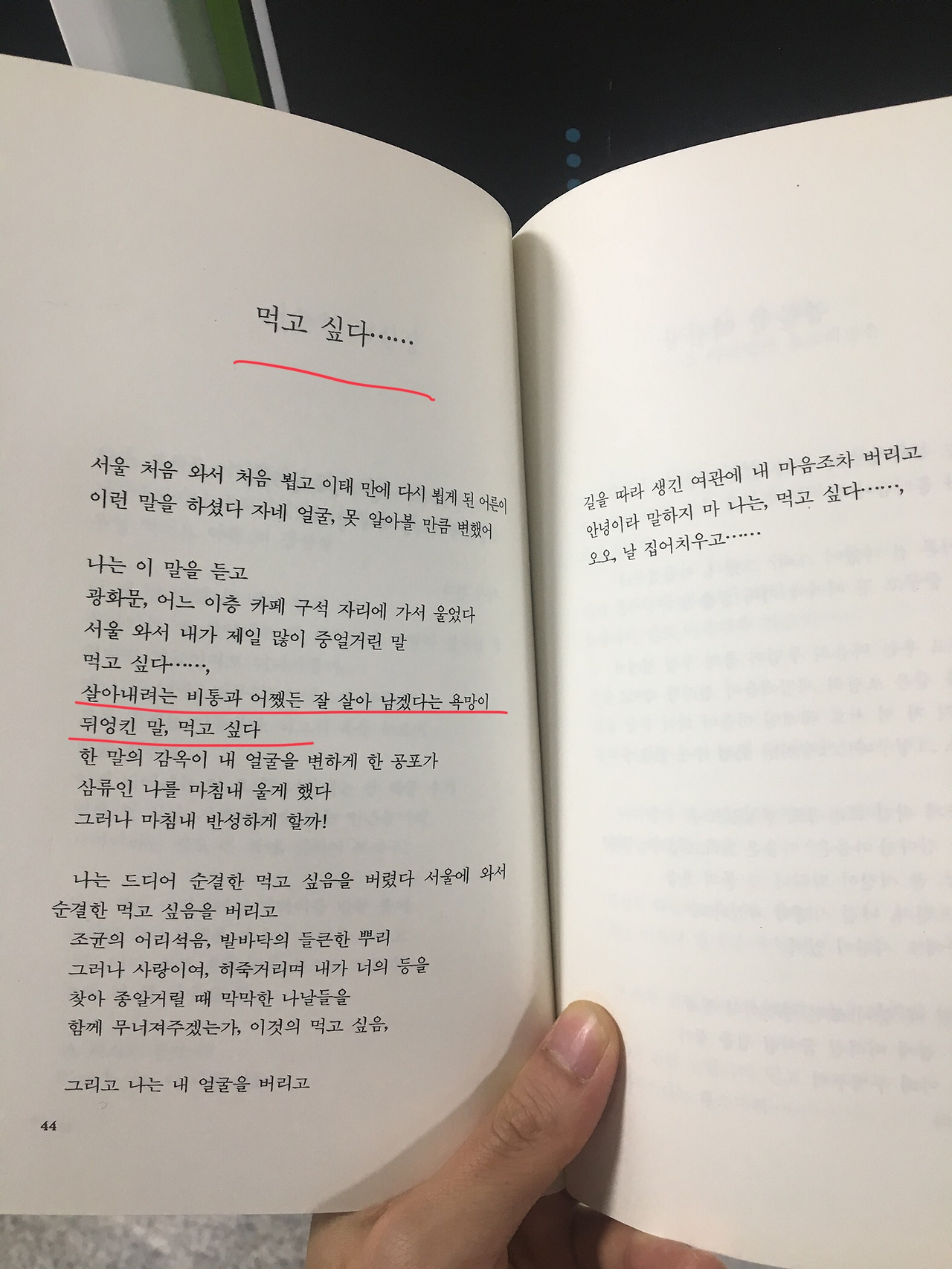 다행스럽게도 '먹고 싶다'는 시가 마음속으로 들어왔다. 시에서 '먹는다'는 욕망에 대해 내가 생각한 단순 식욕의 의미만을 말하진 않았다. 잘 살고 싶다는 강렬한 욕망! 덕분에 내가 왜 그렇게 먹고 싶어 하는지 스스로 돌아볼 계기를 만들어 주었다. 그거면, 충분하다.