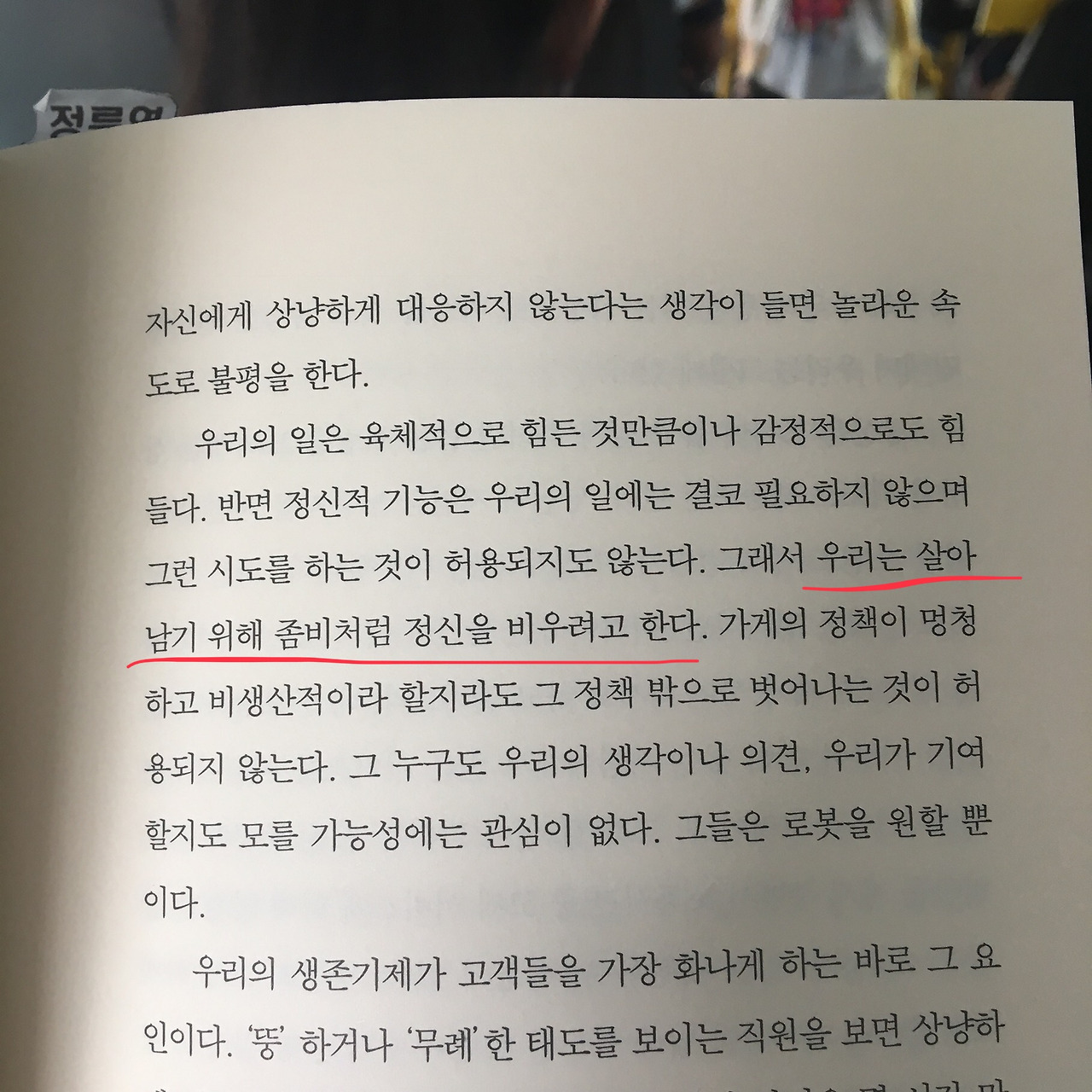 3. 우리의 일은 육체적으로 힘든 것만큼이나 감정적으로도 힘들다. 반면 정신적 기능은 우리의 일에는 결코 필요하지 않으며 그런 시도를 하는 것이 허용되지도 않는다. 그래서 우리는 살아남기 위해 좀비처럼 정신을 비우려고 한다.