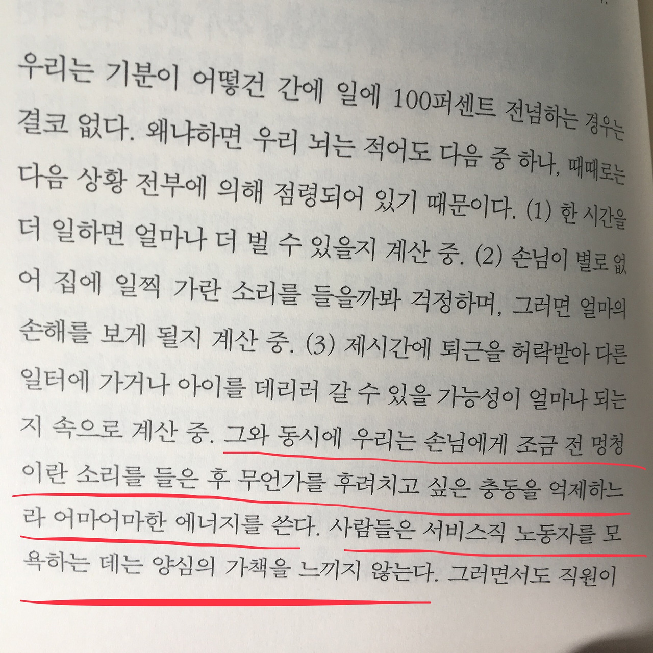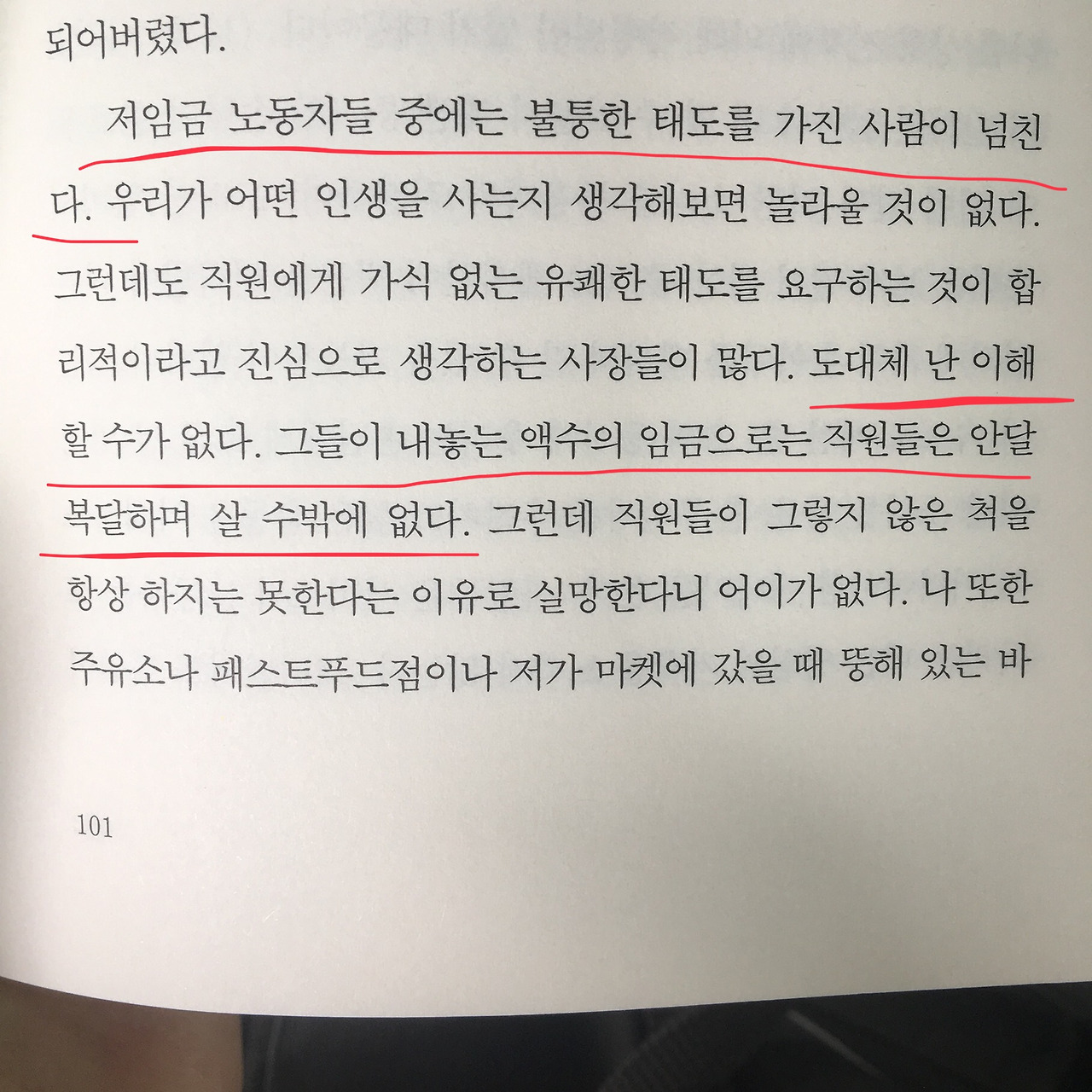 2. 내가 이해하지 못하는 것은 따로 있다. 왜 패스트푸드점에 와서 삭스5번가 같은 고급 백화점이나 자기 돈을 넣어둔 은행에서나 기대할 수 있는 그런 미소와 우아한 응대를 나에게 원하는가 말이다. 서비스의 노동자들이 좀더 미소를 짓고 상냥해야 한다고 진심으로 생각하는 이들은 뭔가를 모르는 사람들이라는 생각밖에 들지 않는다. 존중과 배려, 직장에서의 기본적 공정함 같은 것이 그들의 삶에서는 너무나 당연하기 때문에 그런 것이다.