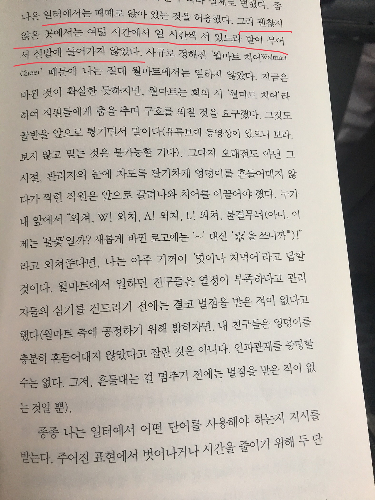 6. 나는 일터에서는 때때로 앉아 있는 것을 허용했다. 그리 괜찮지 않은 곳에서는 여덟 시간에서 열 시간씩 서 있느라 발이 부어서 신발에 들어가지 않았다.