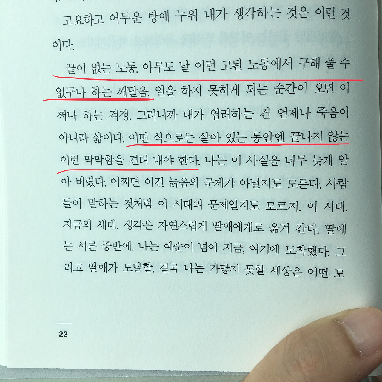 2. 누군가를 보살피는 것의 수고로움, 내가 아닌 누군가를 돌보는 것의 지난함. 실은 나는 아름답고 고결해 보이는 이런 일의 끔찍함과 가혹함을 딸애와 그 애에게 알려 주고 싶은지도 모른다. 183-184쪽