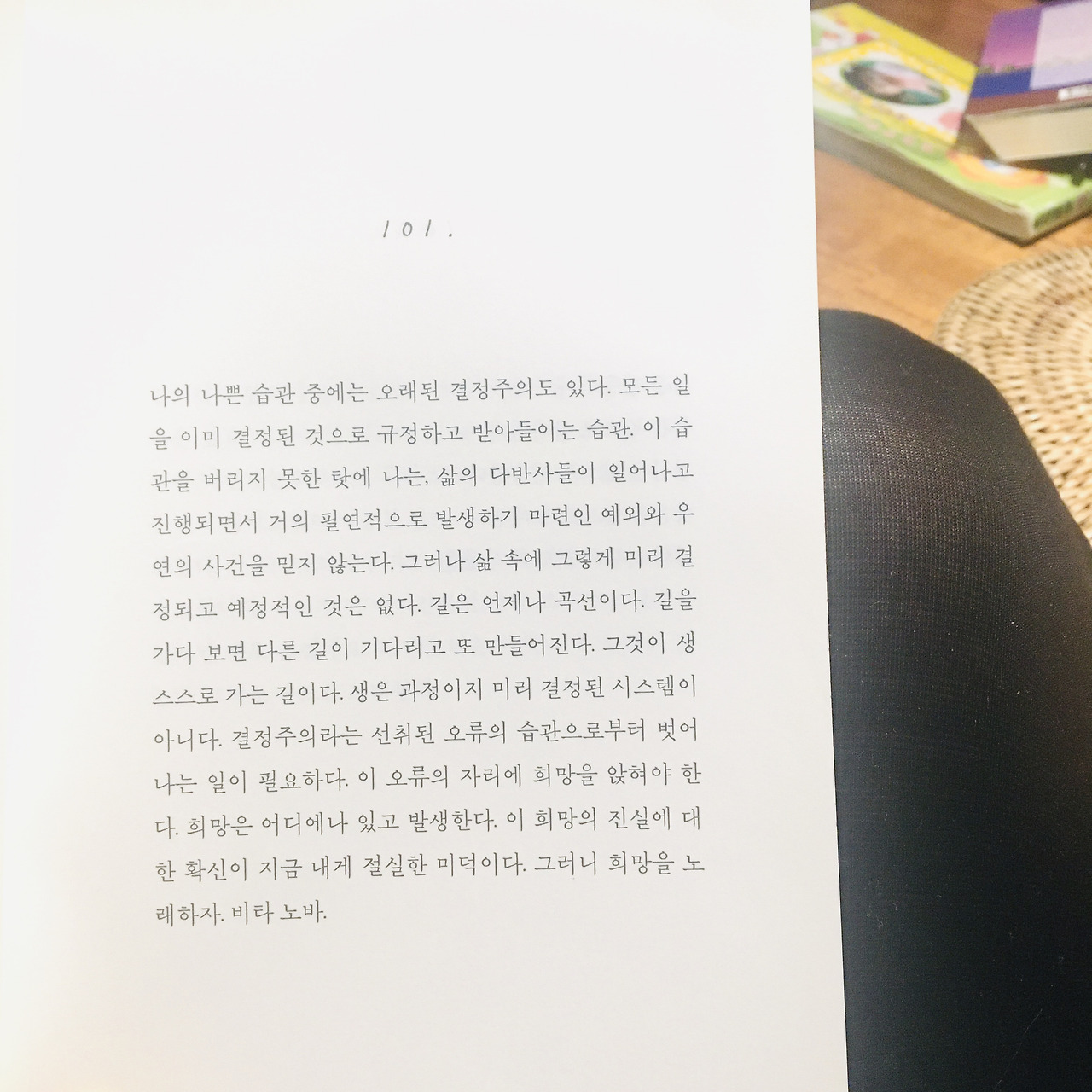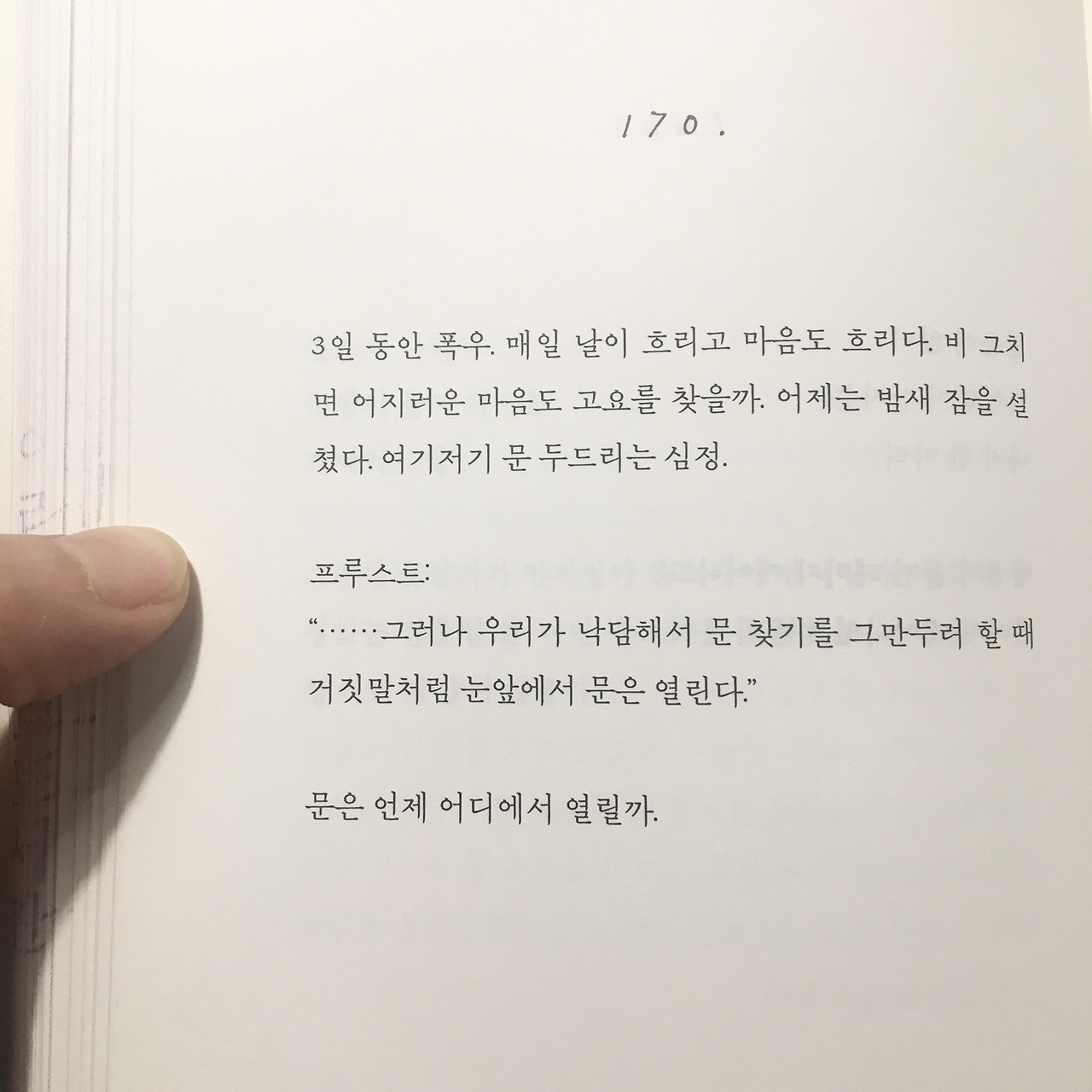 남의 기록을 몰래 훔쳐보는 즐거움이 있다(나는 남의 이야기 보는 걸 즐겨하는 사람이다) 일기가 한 권의 책으로 엮인다는 건 어떤 의미일까. 장문의 에세이를 기대했는데 페이지마다 시구처럼 짧다. 그래서 잘 읽혔다. 철학자이자 미학자가 쓰는 일기는 어떤 언어들일까. 범상치 않겠다 싶었는데 역시나 그의 일기 속 문장들은 아름다웠고, 아픈 사람의 마음을 꾹꾹 눌러담아 발현시킨 문장들마다 멈칫하며 한없이 생각에 잠겼다. 잘 쓰고 싶다!