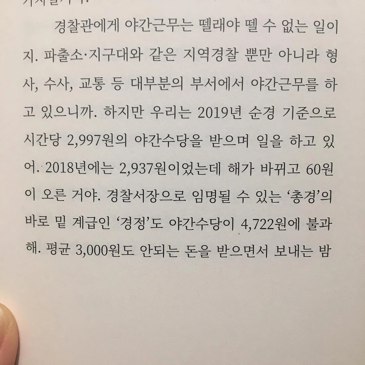 작년 순경기준 야간수당이 2,997원이라니 놀라운 숫자다. 돈이 뭘까. 회사에서 야근수당 안주는 곳에서 일했지만 나라 공무원인데, 경찰관이 밝힌 야간수당 액수가 현실을 비추는 기분이 든다.