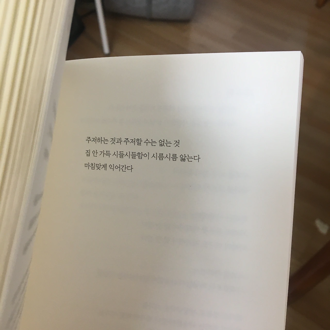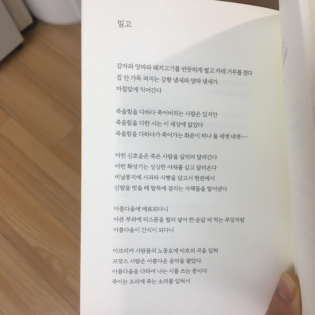 시가 좋은 이유는 보이지 않는 생각을 언어로 보도록 만들어주기 때문이다. 이번 시집에서 가장 좋았던 시는 “밀고”였다. 카레 이야기로 시작해서 잘 만든 카레로 마무리하는 스킬에 심쿵했다. 평소에 내가 카레를 잘 만들어 먹어서 이 시가 더 와 닿았던 듯싶다.