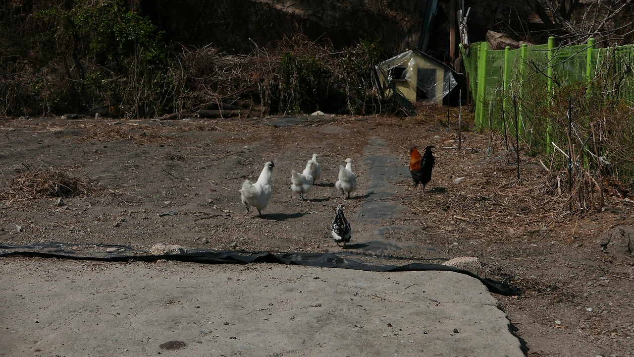 농장 문을 열면 방목된 여섯 마리의 닭들이 놀고 있다. 다행히 이 녀석들은 내 텃밭 작물엔 별 관심이 없어 보였다. 4월 2일(토)에 가서 잔뜩 물을 줬는데 작물들에게 물이 부족해보인다.