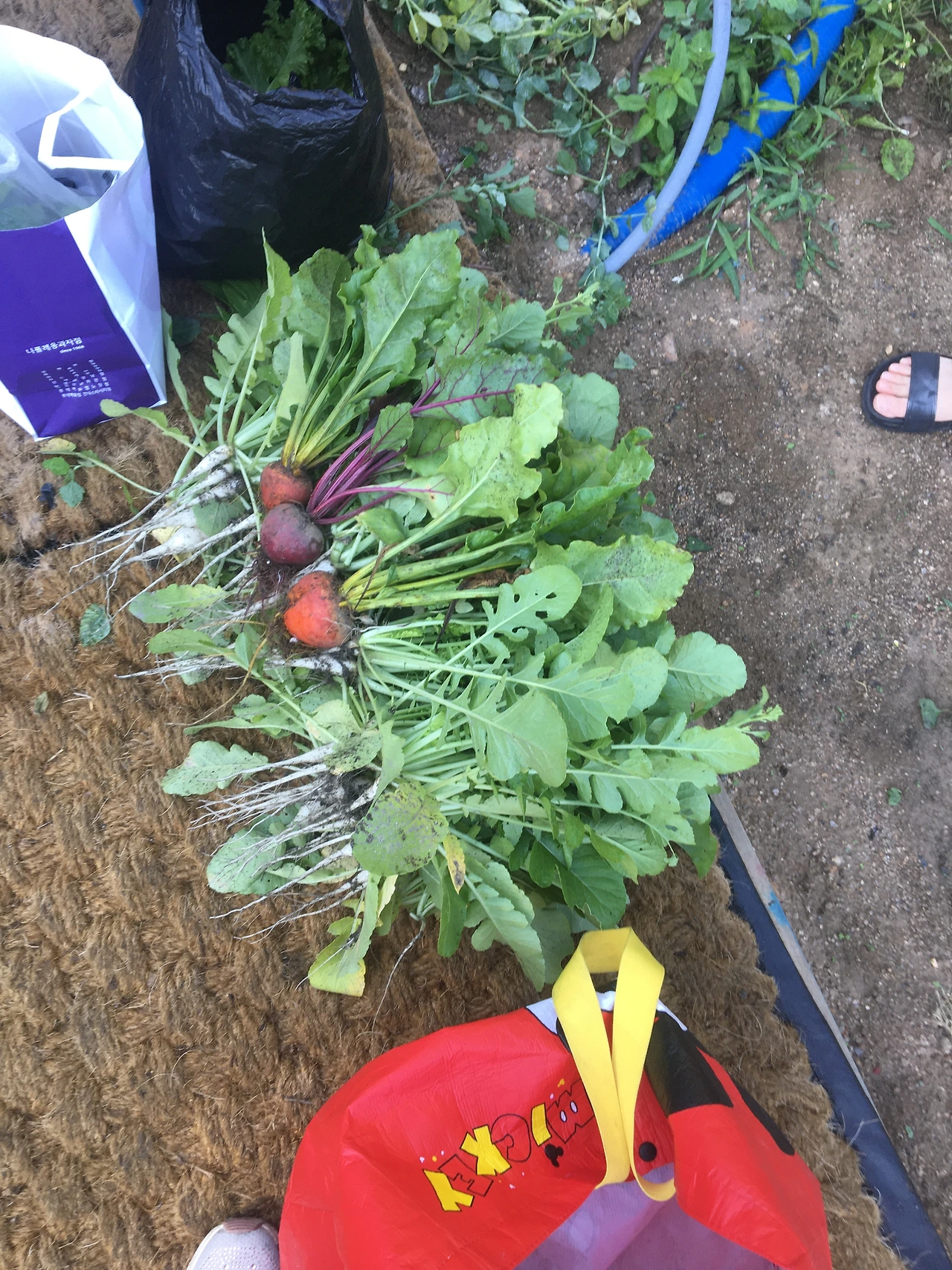 혹시 몰라 비트도 수확했다. 조금 더 알이 여물어야 했다. 3월에 심을 때 비트도 궁금한 작물 중 하나였다. 사실 나는 비트를 잘 먹지 않는다. 텃밭은 호기심을 창작하기에 참 좋은 판이다. 브로콜리도 잘 자라고, 적양배추는 열심히 자라는 중인데 장마가 오면 어떻게 될지 모르겠다.