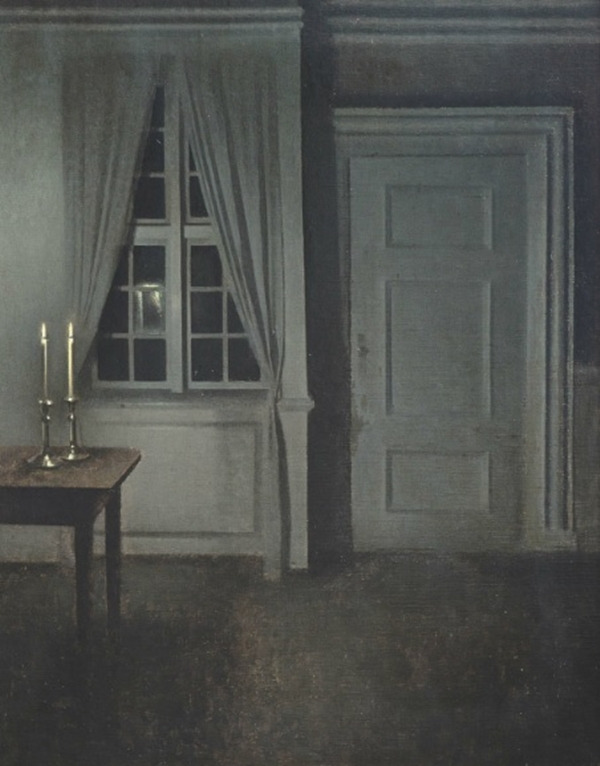 빌헬름 함메르쇠이는 덴마크 화가로 코펜하겐 스트란가데 30번지(Standgade 30)에 위치한 집에서 살며, 집 안의 모습과 아내의 뒷모습을 주로 그렸다. 그만의 독특한 ‘그리자이유(Grisaille)’ 화법으로 표현된 그림은 회색조의 차분함과 깊이감이 매력이다. ‘그리자이유’는 회색조 색채만을 사용하여 그 명암과 농담으로 그리는 화법이다. 무채색의 회색톤 속에서 빛은 더 큰 힘을 내는 듯하다. 햇살은 더 따스해지고, 촛불은 더 은은해졌다. <두 개의 촛불이 있는 실내 풍경> 작품 속 그가 살던 집에 세월이 소복이 자리 잡았다. 수없이 드나들었던 문에는 여기저기 칠이 벗겨지고, 문손잡이 주변에는 그들의 그림자가 겹겹이 쌓였다. 가족들의 발자국이 담긴 바닥, 소박한 커튼에도 세월이 묻어있다. 사용감 있는 식탁 위에 반짝이는 촛대 두 개 있다. 아직 집에 오지 못한 가족을 위한 그의 따뜻한 마음처럼 두 개의 초가 등대처럼 자리를 지키고 있다.