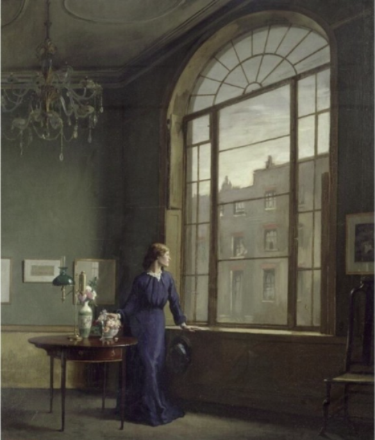 높은 천장과 커다란 창이 있는 윌리엄 오르펜의 <A window in London street, 1901> 작품은 요즘 우리들에게 ‘핫 플레이스‘로 통하는 고풍스러운 카페 같다. 탁 트인 전망을 한 이곳에는 사람들의 눈길을 끌만한 아름다운 장식의 샹들리에, 일정한 높이에 맞춰 전시된 액자들, 고풍스러운 테이블, 도자기 화병에 꽂힌 탐스러운 꽃으로 장식이 되어있다. 이렇게 멋진 곳에 심해처럼 푸른 드레스를 입은 여인이 창가에 기대어 서있다. 한 손은 장식품 위에, 다른 한 손은 모자를 잡은 채 창틀에 올렸다. 창밖을 보는 여인의 시선을 따라가보니, 회색빛 벽에 창문마다 빨간 포인트를 준 높은 건물이 보인다. 그리고 파랑, 초록, 연두, 노랑으로 그라데이션 된 하늘이 있다.