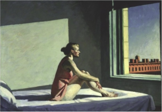조금 전까지 나를 바라보고 있었을 것 같은 여인은 고개만 옆으로 돌려서 창밖을 바라보고 있다. ‘저 건너편 아파트에는 어떤 사람들이 살까?’, ‘저 사람들은 위해 저렇게 바쁘게 다니는 걸까?’ 골똘히 생각하는 여인의 옆모습을 바라보고 있으니, 에드워드 호퍼의 <Morning sun, 1952> 작품을 떠오른다. 서로 다른 작품 속의 두 여인의 옆모습이 참 많이 닮았다. 그림자를 넣어 더 날렵해 보이는 턱선, 창 너머 세상을 바라보는 시선은 참 외롭게 느껴진다. 사교적 모임 공간처럼 보이는 곳에 서있는 여인과 지극히 개인적인 침실에 있는 여인에게서 외로움이라는 공통된 감정을 느껴지는 이유가 궁금해졌다.
