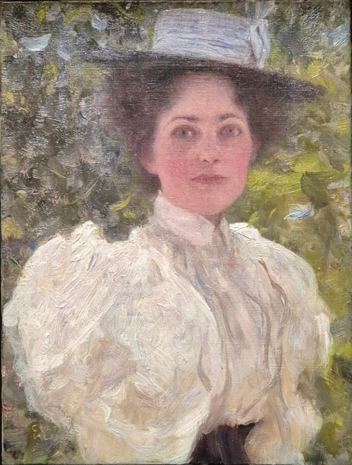세련된 모자를 쓰고 소매가 풍성하게 부푼 블라우스를 입은 여인이 파란 눈으로 관람자를 바라보고 있다.