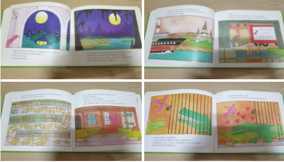 펠릭스 발로통의 작품 속 보랏빛 노을과 노오란 태양은 한 마리 ‘악어’로 변신해 나에게 인사한다. 악어 빌이다! 아이들이 어렸을 적 읽었던 <꼬마제인이 없어졌어요> 그림책의 주인공 빌이 나타난 거다. 사촌동생 꼬마제인이 없어진 걸 알게 된 악어 빌과 악어새 피트가 꼬마제인을 찾아 떠나는 모험 이야기지만, 그 안에 환경보호 내용도 있는 그림책이다. 그림책 안에는 오렌지색, 보라색, 핑크색, 청록색 등 펠릭스 발로통의 그림 속 색들이 들어있다. ‘7~8년 봤던 그림책을 떠올리다니!’ 나도 모르게 감탄을 하며, 그림책 속 이야기뿐 아니라 색감도 내 안에 스며들어와 있음을 깨닫는 순간이다. 어릴 적 아이들과 함께 한 순간순간이 나에게도 스며들어 있다면, 아이들 또한 그 순간순간들이 스며들어 있을 거라는 확신이 들었다. 아이들 어릴 적 시간을 떠올리며, 난 어느새 미소를 짓는다. 이게 행복이지 않을까?