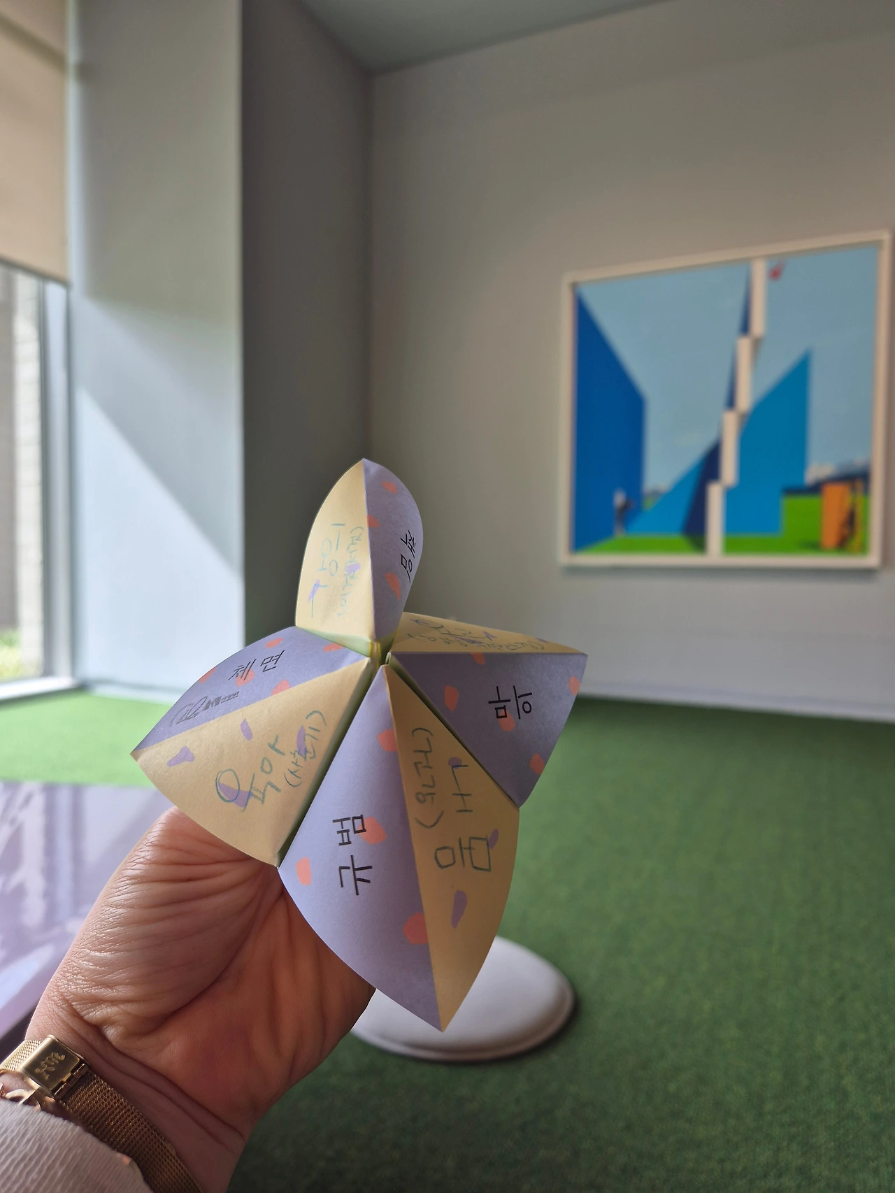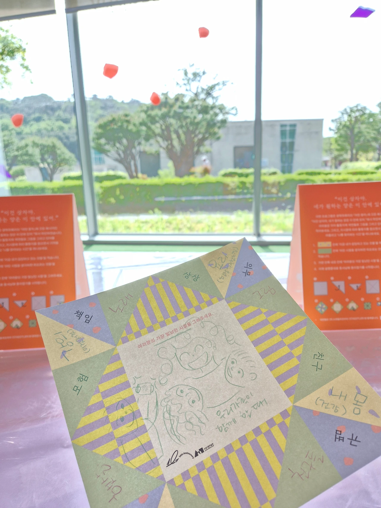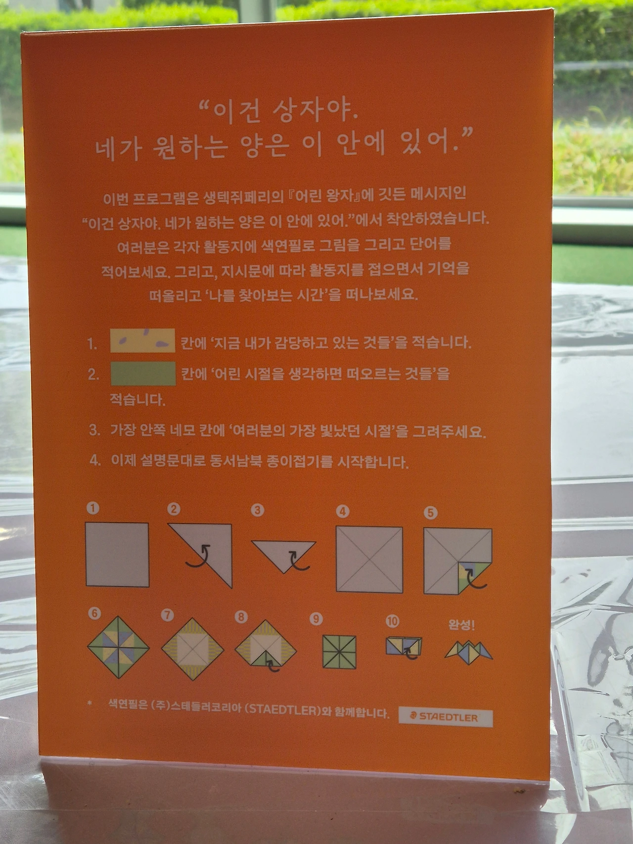 창가 넓은 잔디밭(비록 진짜는 아니지만)에 앉아 활동 순서에 맞춰 내 생각을 적고, 종이접기를 하며 잠시 동심으로 돌아갔다.